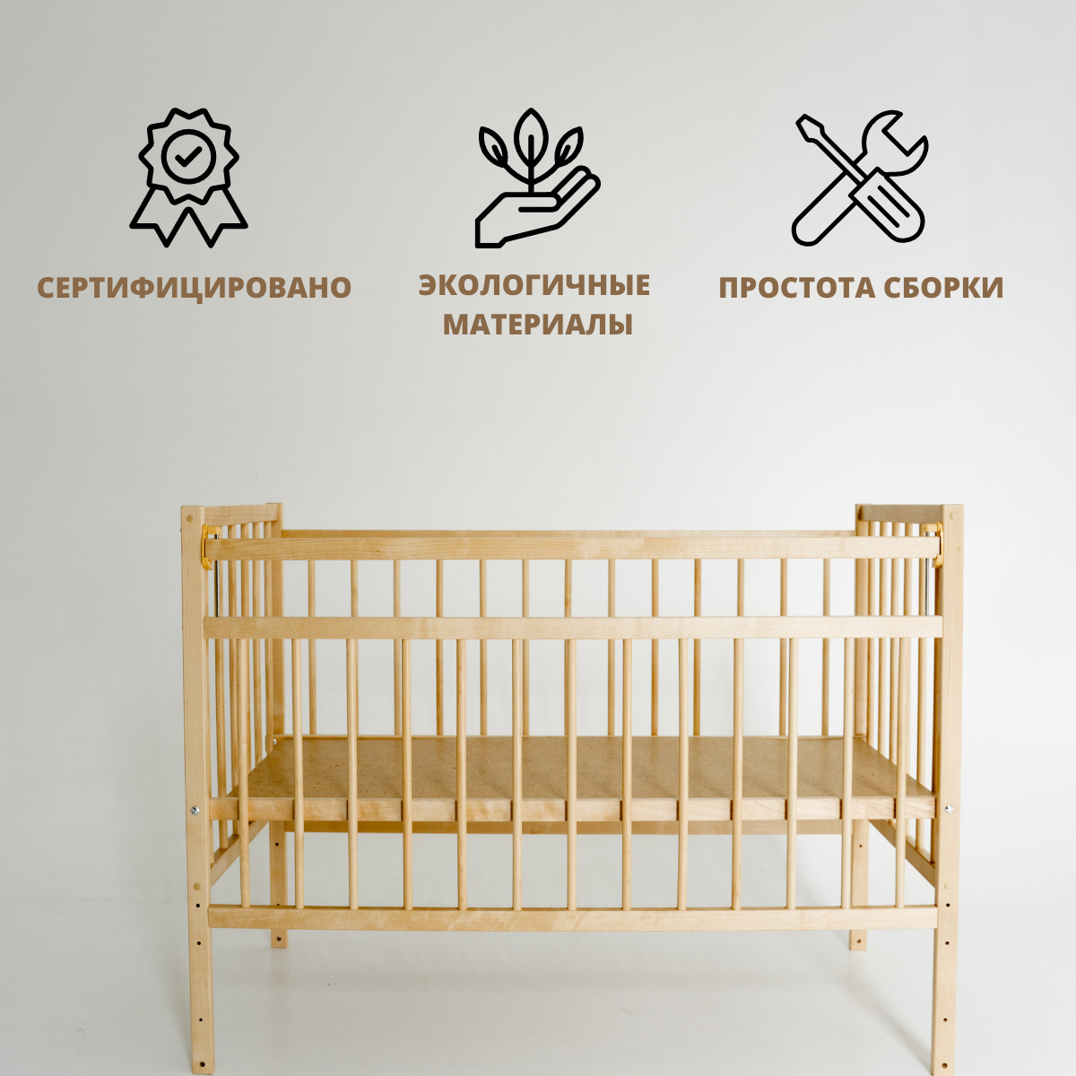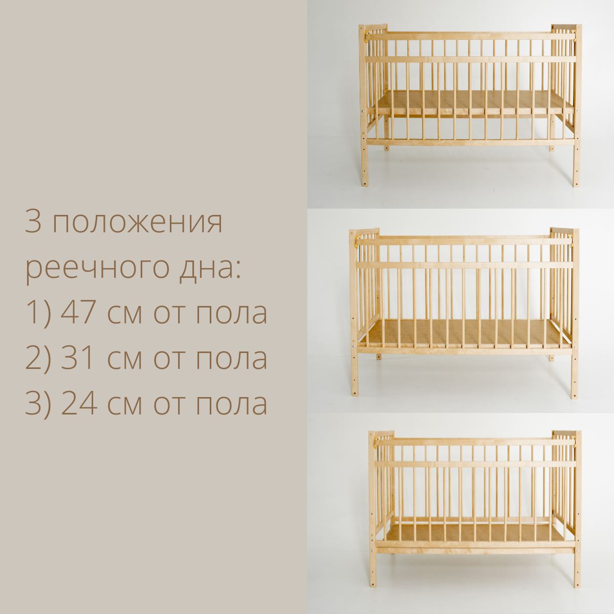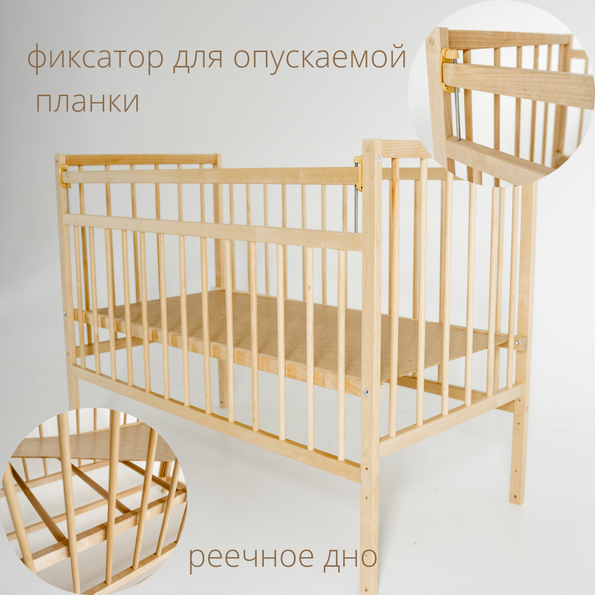 | Особенности | колеса / лакокрасочное покрытие на водной основе / опускается дно / опускающаяся боковина / ортопедические свойства / приставная / стопор колес / съемная боковина |