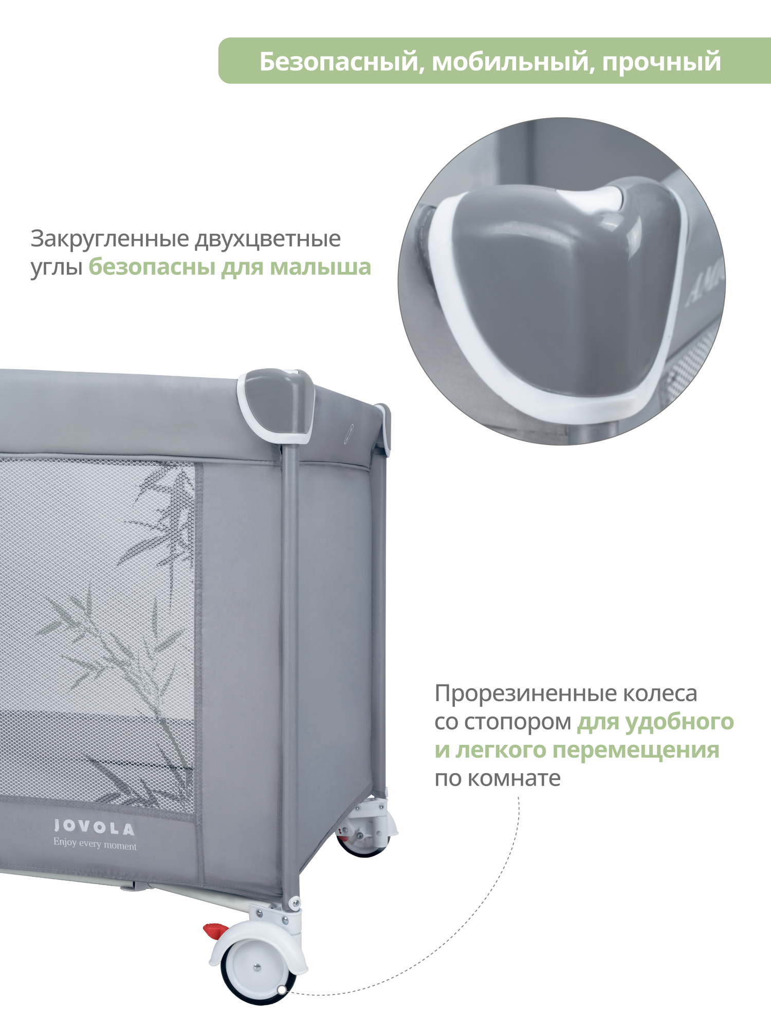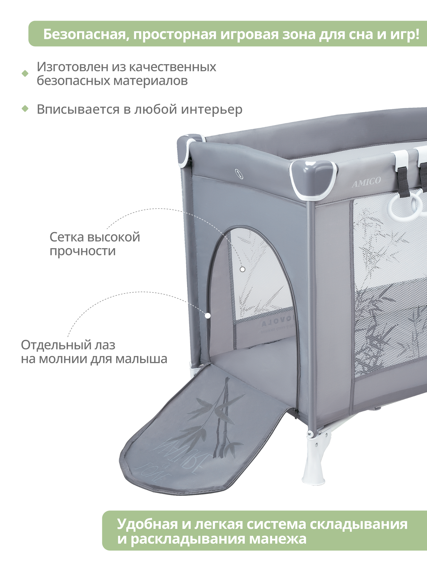 Купить Манеж-кровать JOVOLA AMICO, 0-36 мес, складной, с аксессуарами, 2 уровня, серый бамбук