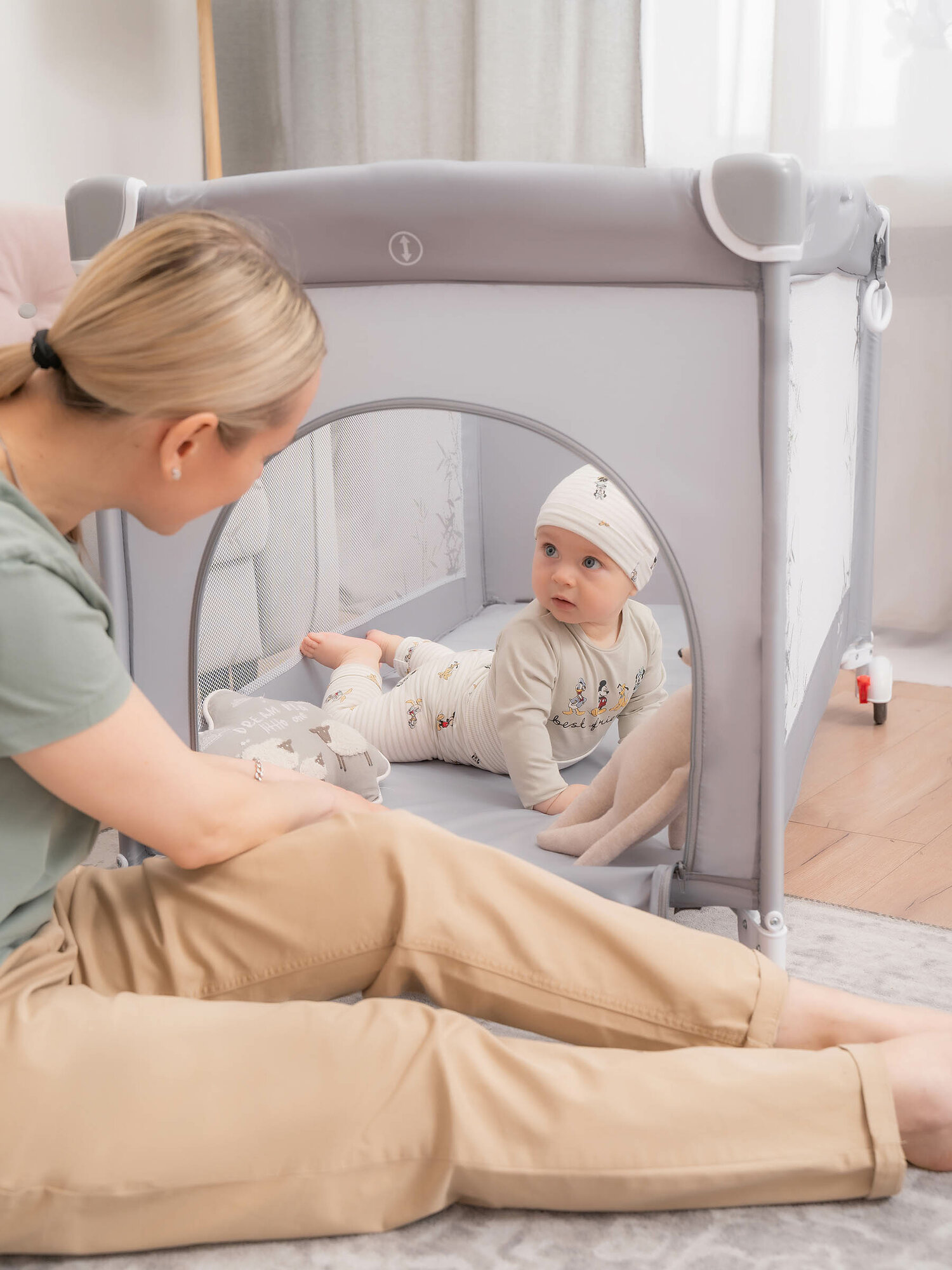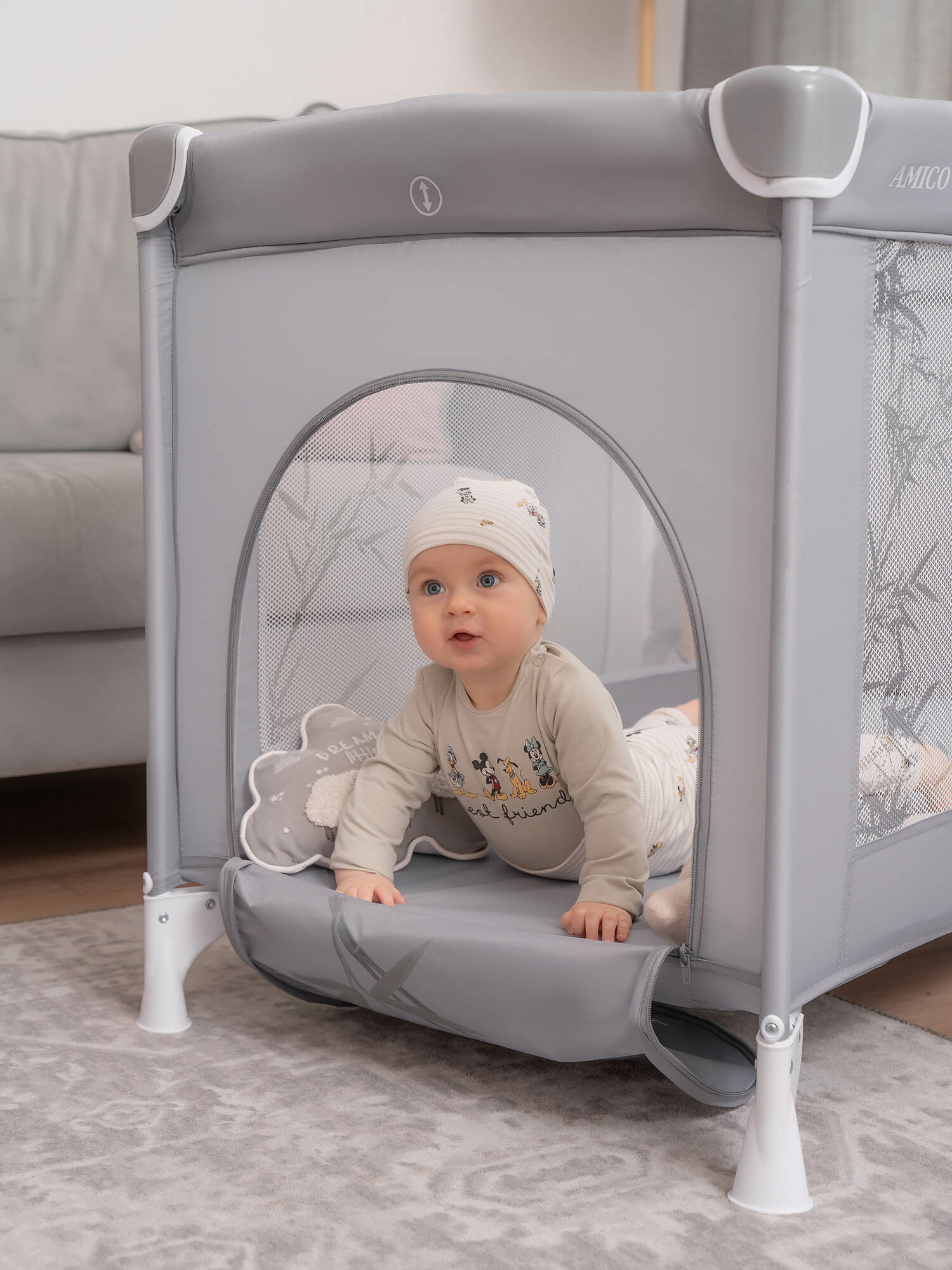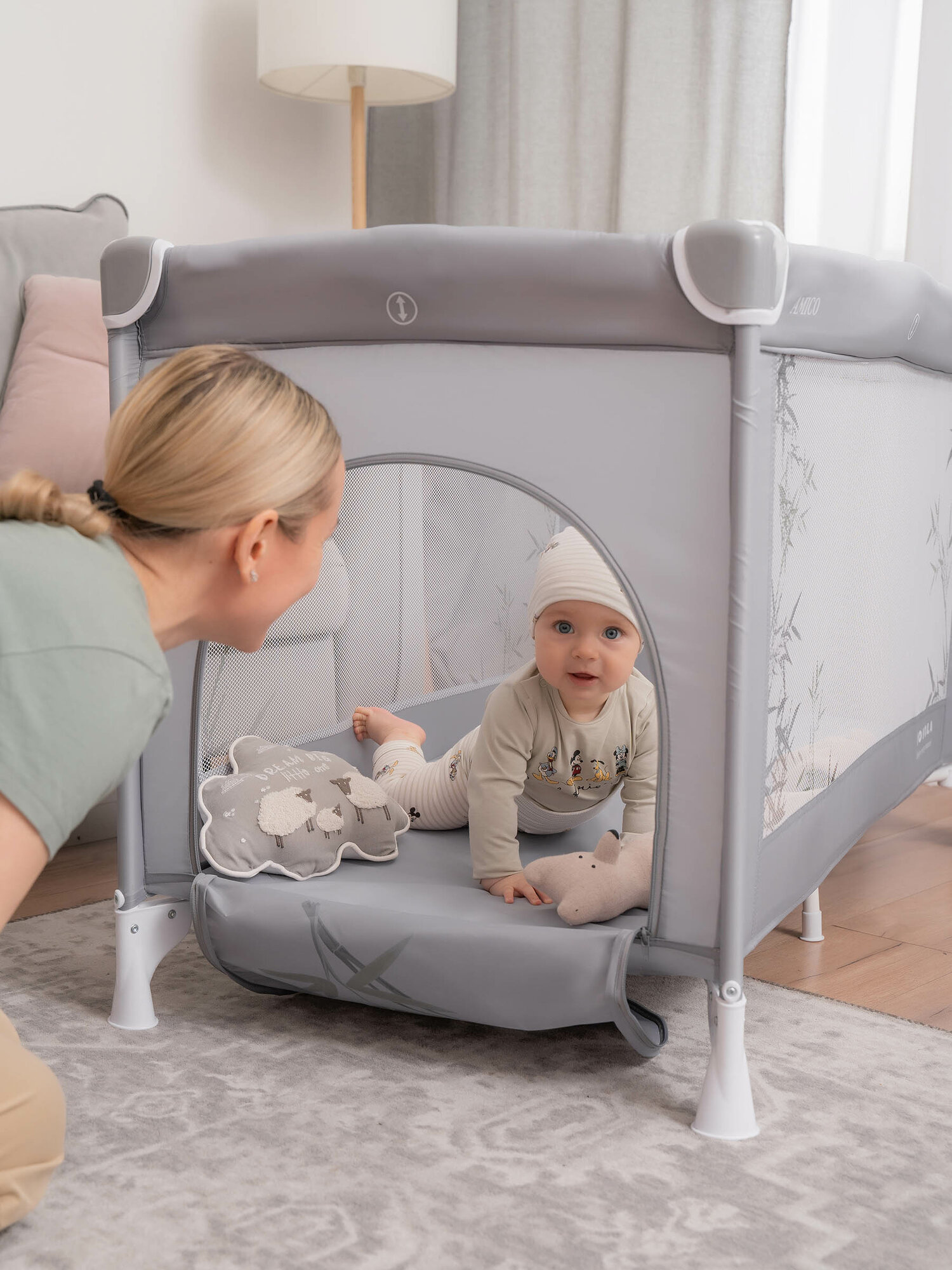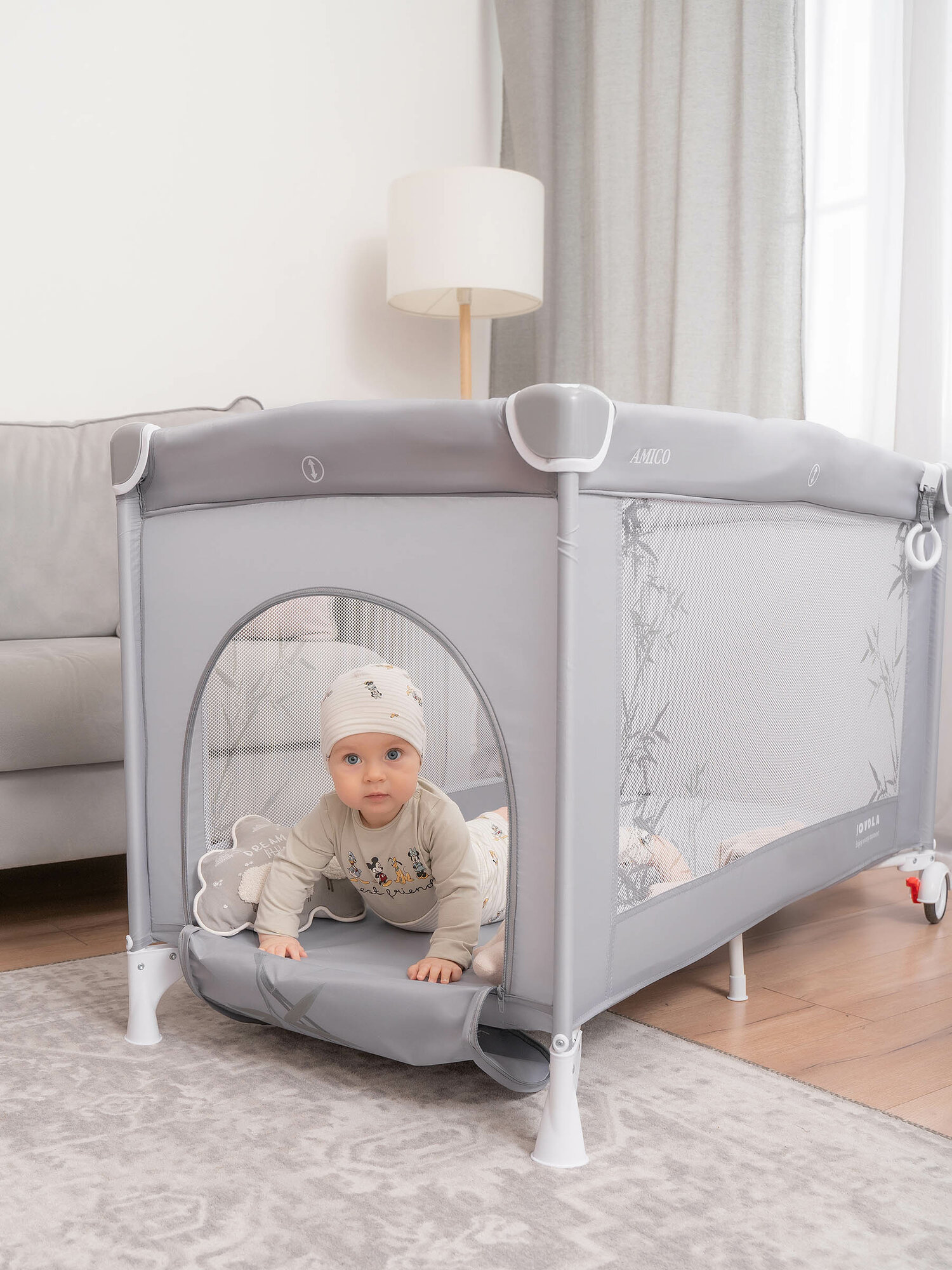 Манеж-кровать JOVOLA AMICO, 0-36 мес, складной, с аксессуарами, 2 уровня, светло-серый