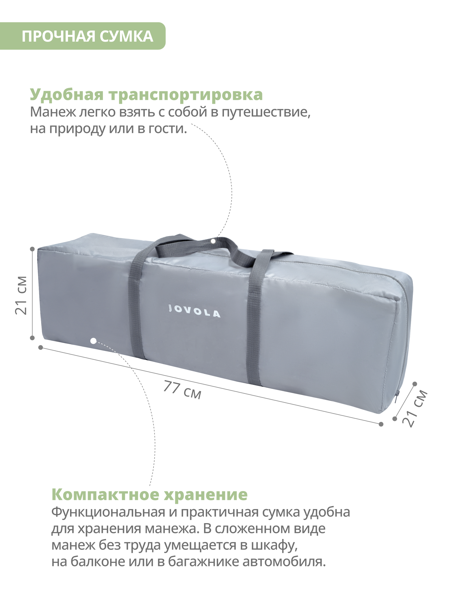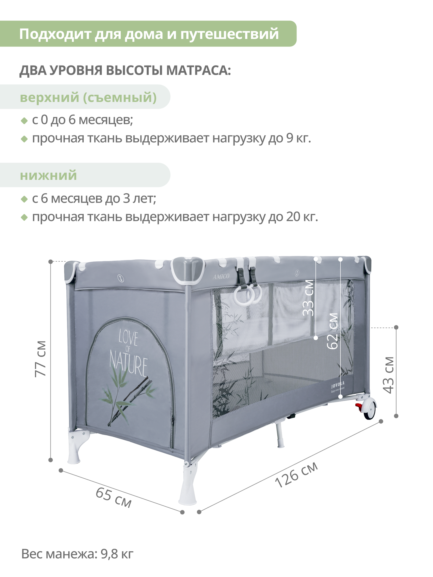 Манеж-кровать JOVOLA AMICO, 0-36 мес, складной, с аксессуарами, 2 уровня, зеленый