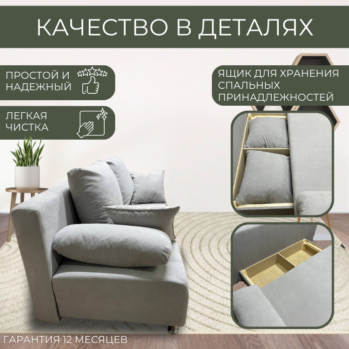 | Особенности | антивандальная обивка, без подлокотников, съемные подушки, ящик для белья |