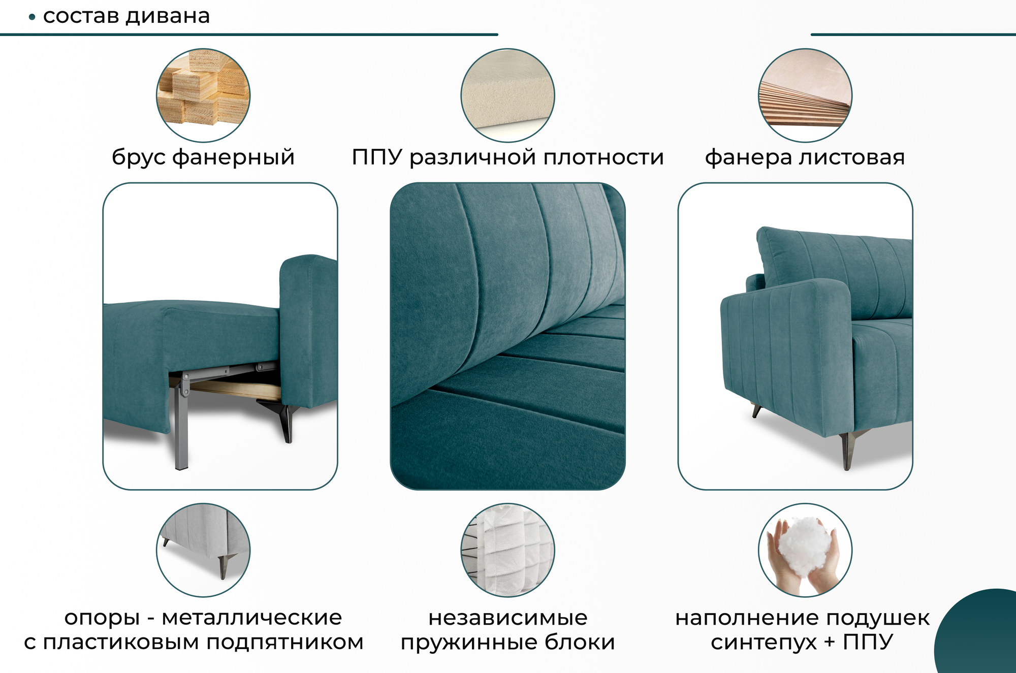 | Особенности | пружинный блок, раскладная конструкция, с подлокотниками, съемный чехол, ящик для белья |