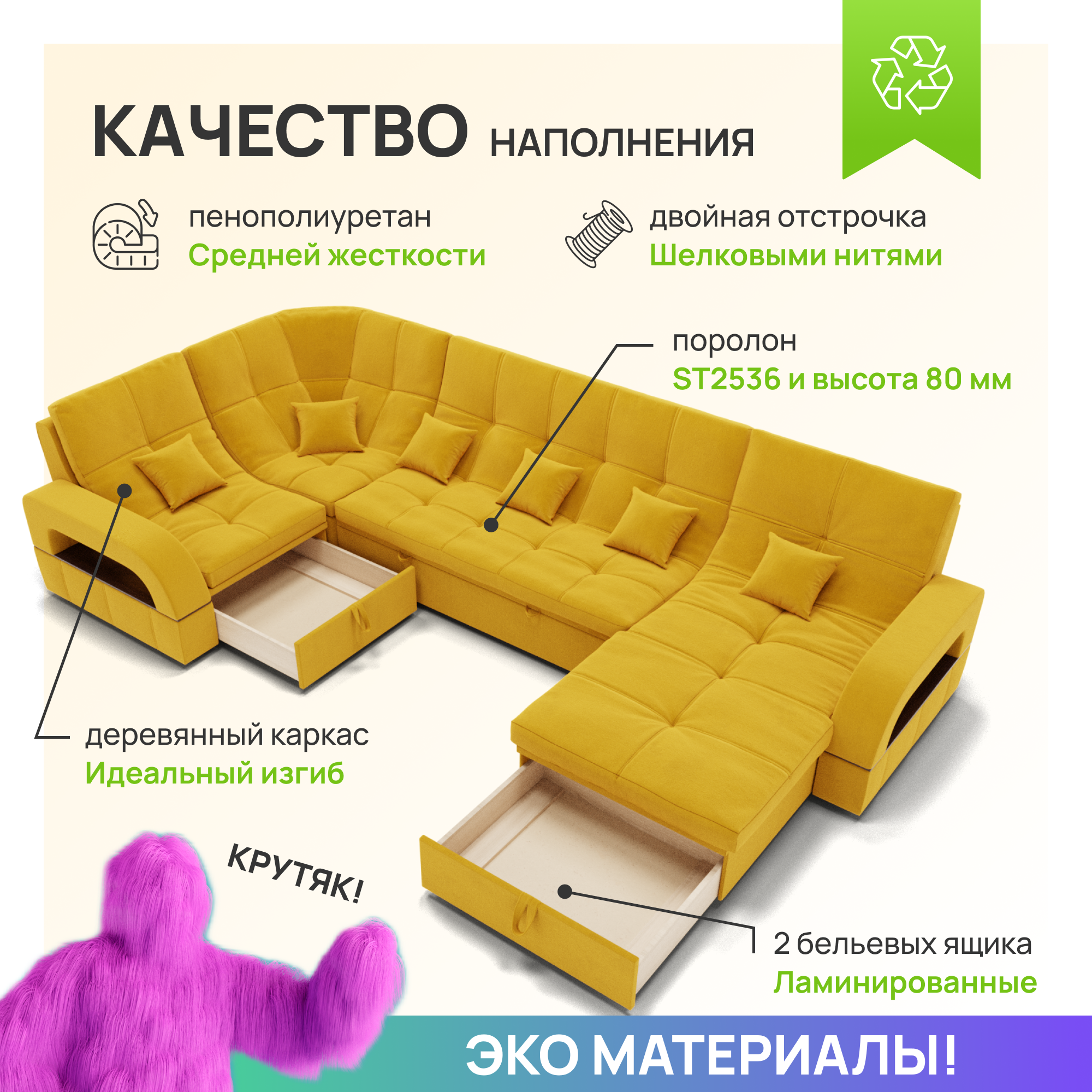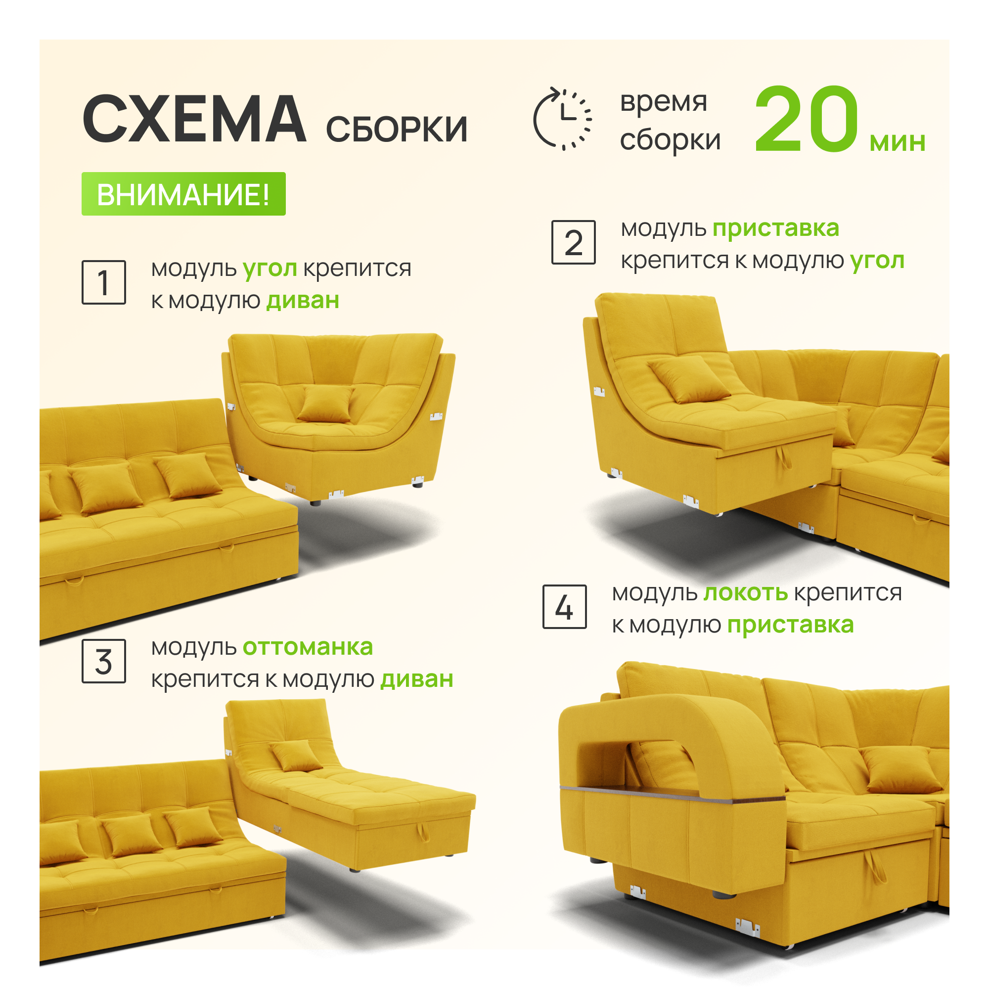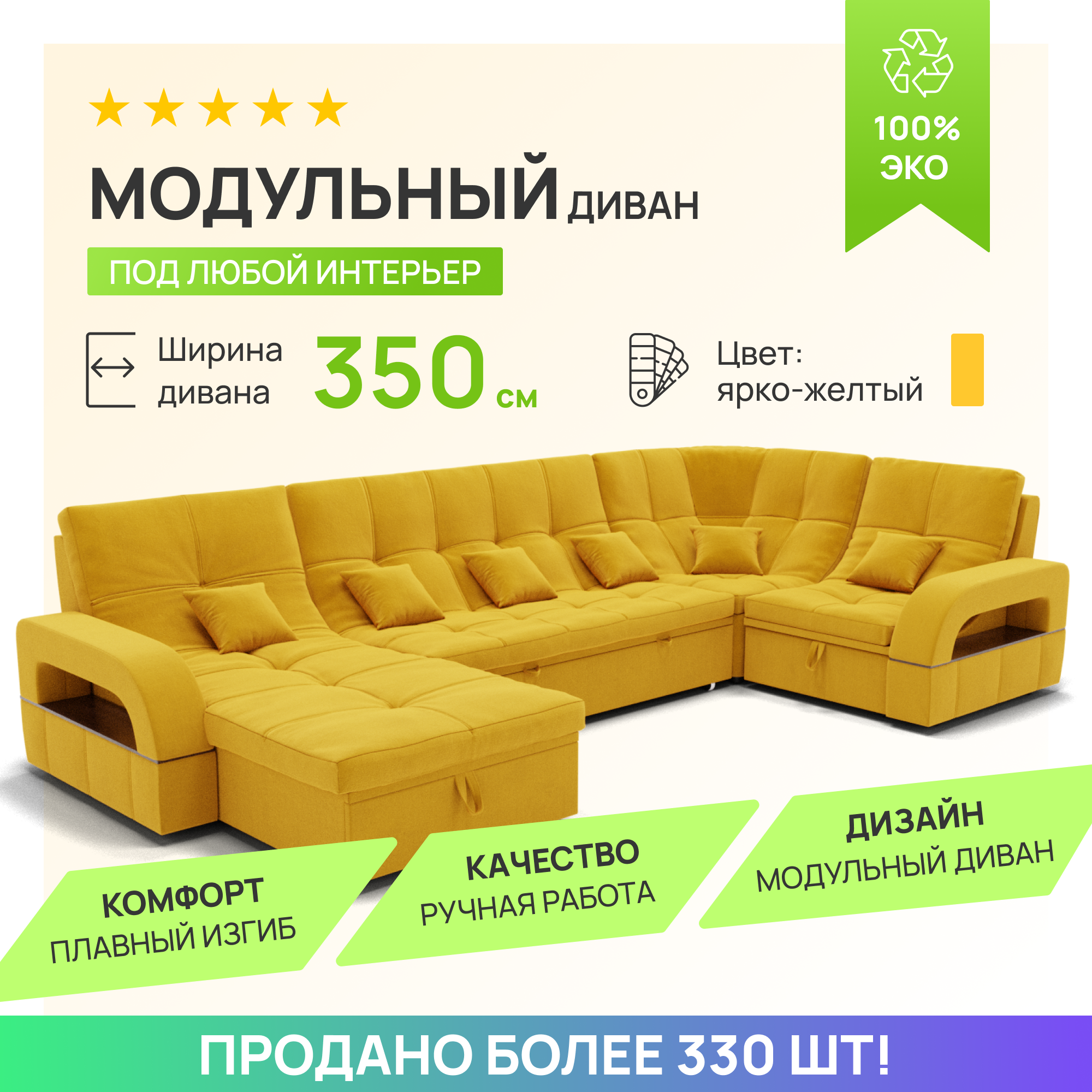 СохранитьМодульный диван, Майами-4 ,Велютта люкс 40 премиум класса YORCOM,350x135x97,Жёлтый. Велюр,ППУ,ДВП,Дерево,механизм Венеция. интересное: