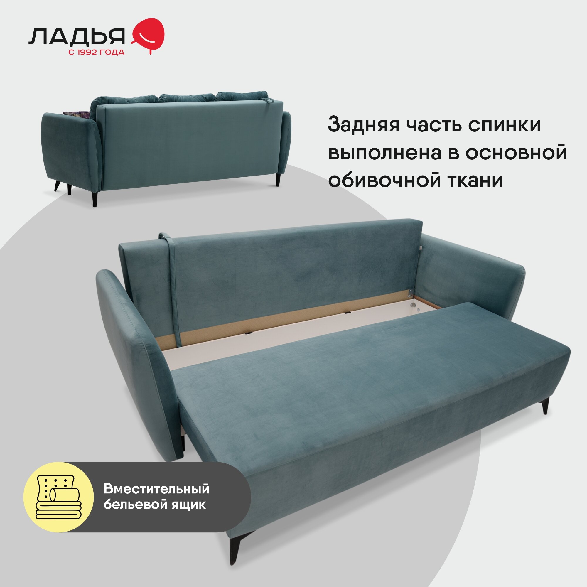 | Особенности | пружинный блок, раскладная конструкция, с подлокотниками, съемные подушки, ящик для белья |