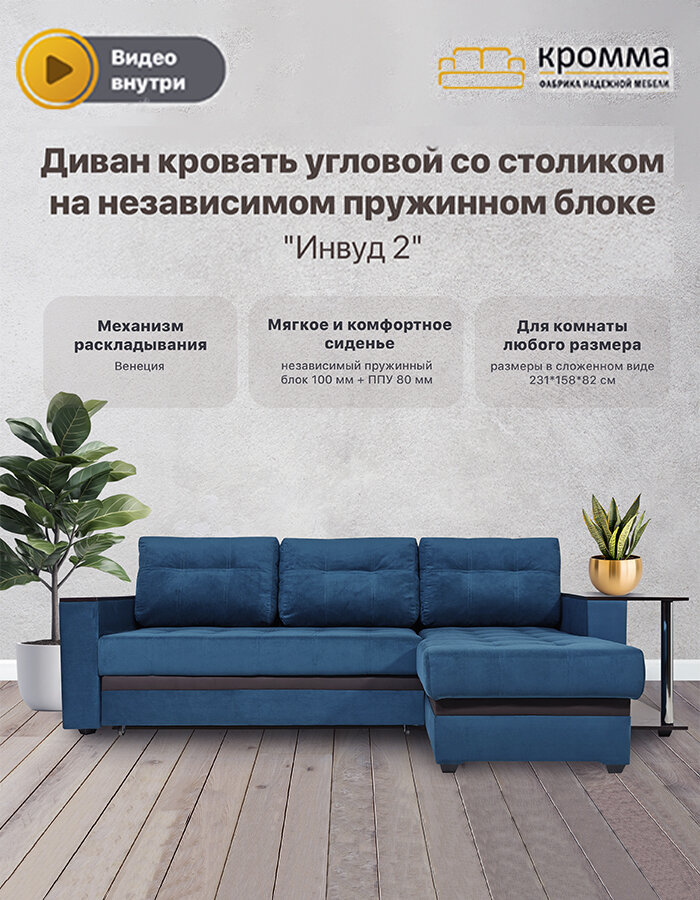 СохранитьКромма Диван Инвуд лайт 2 угловой со столом двухместный, Велюр, синий/ Velutto 26 интересное: