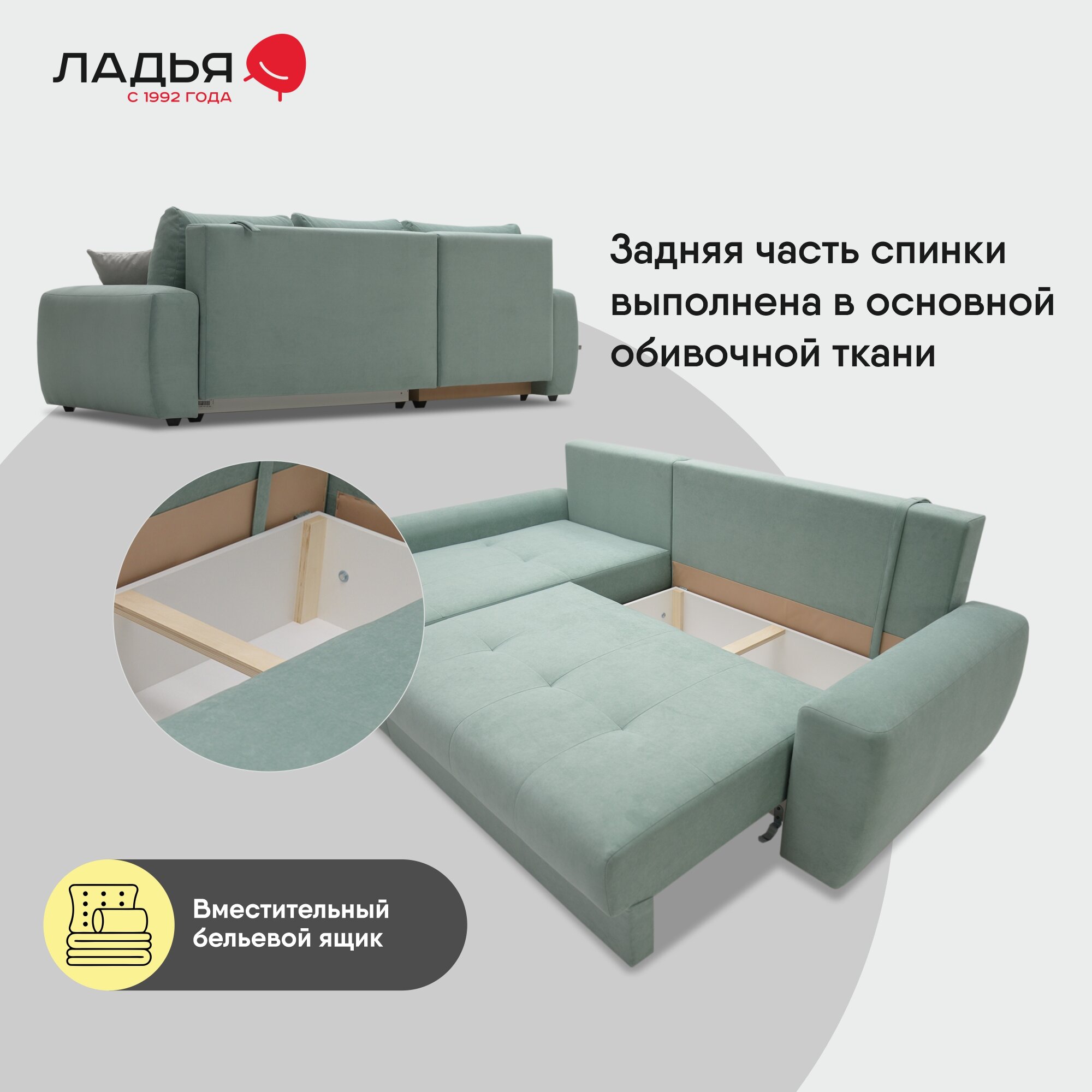 | Особенности | пружинный блок, раскладная конструкция, с подлокотниками, съемные подушки, ящик для белья |