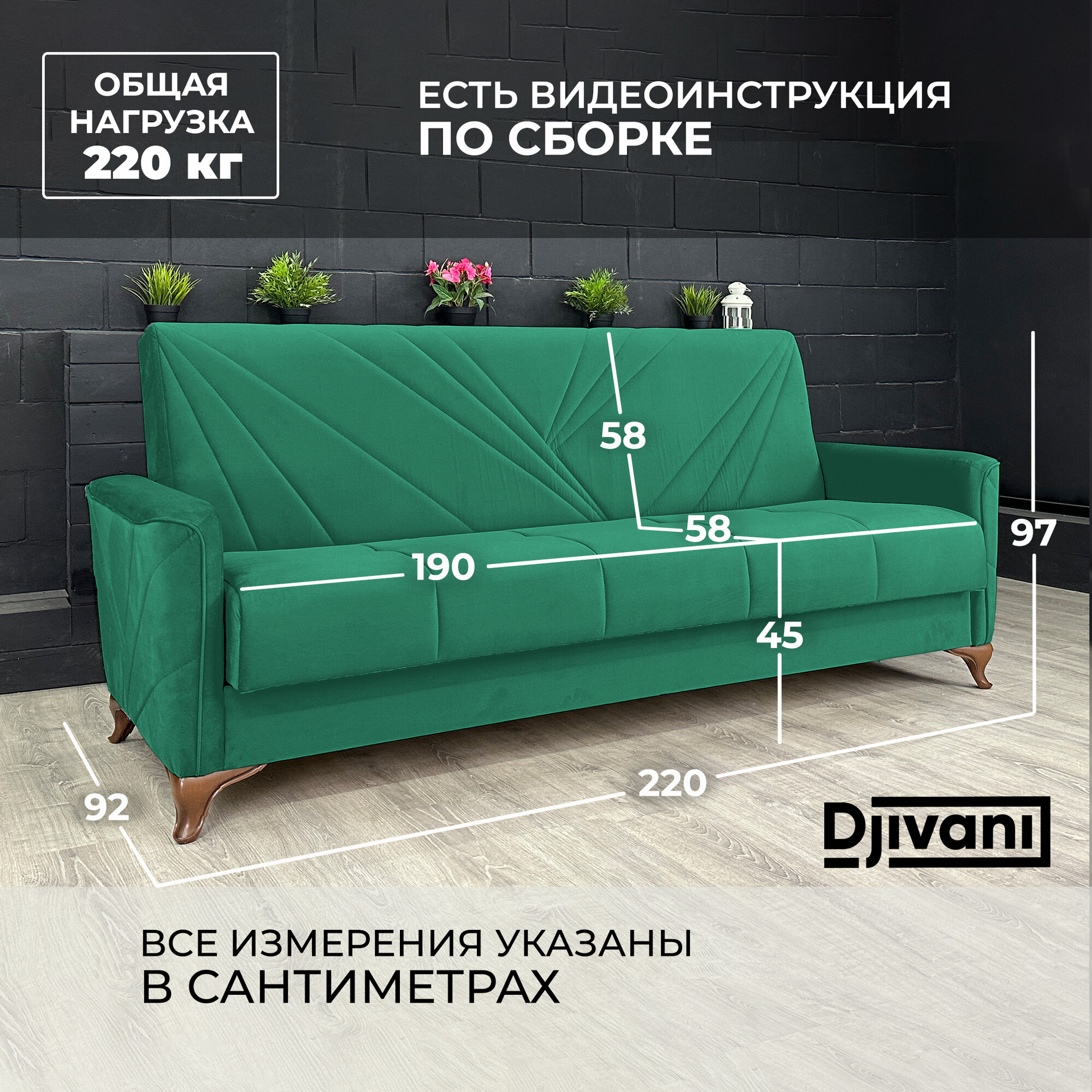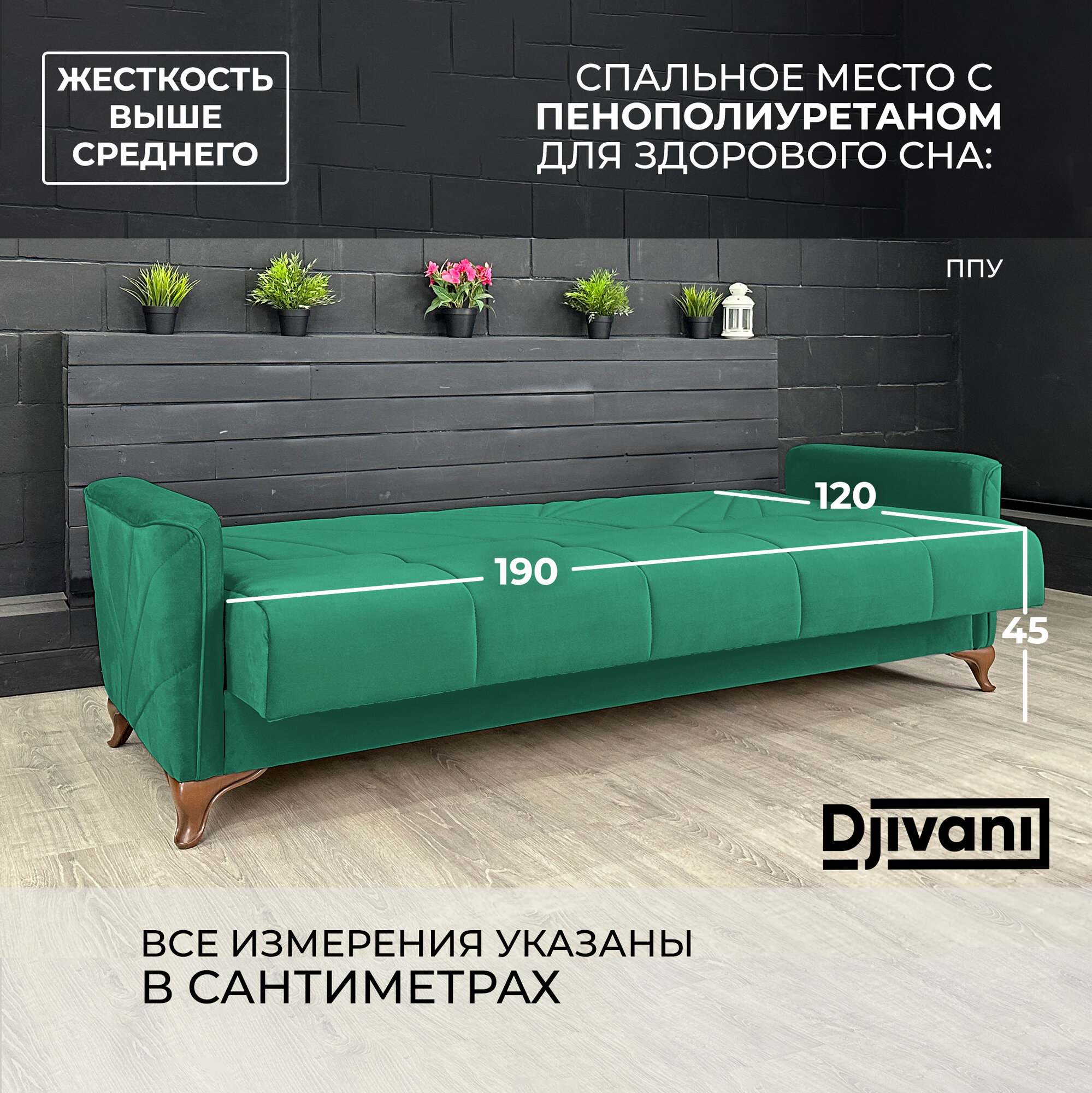 Купить Диван-книжка Kёльн Велюр зелёный / ножки - коричневые Djivani