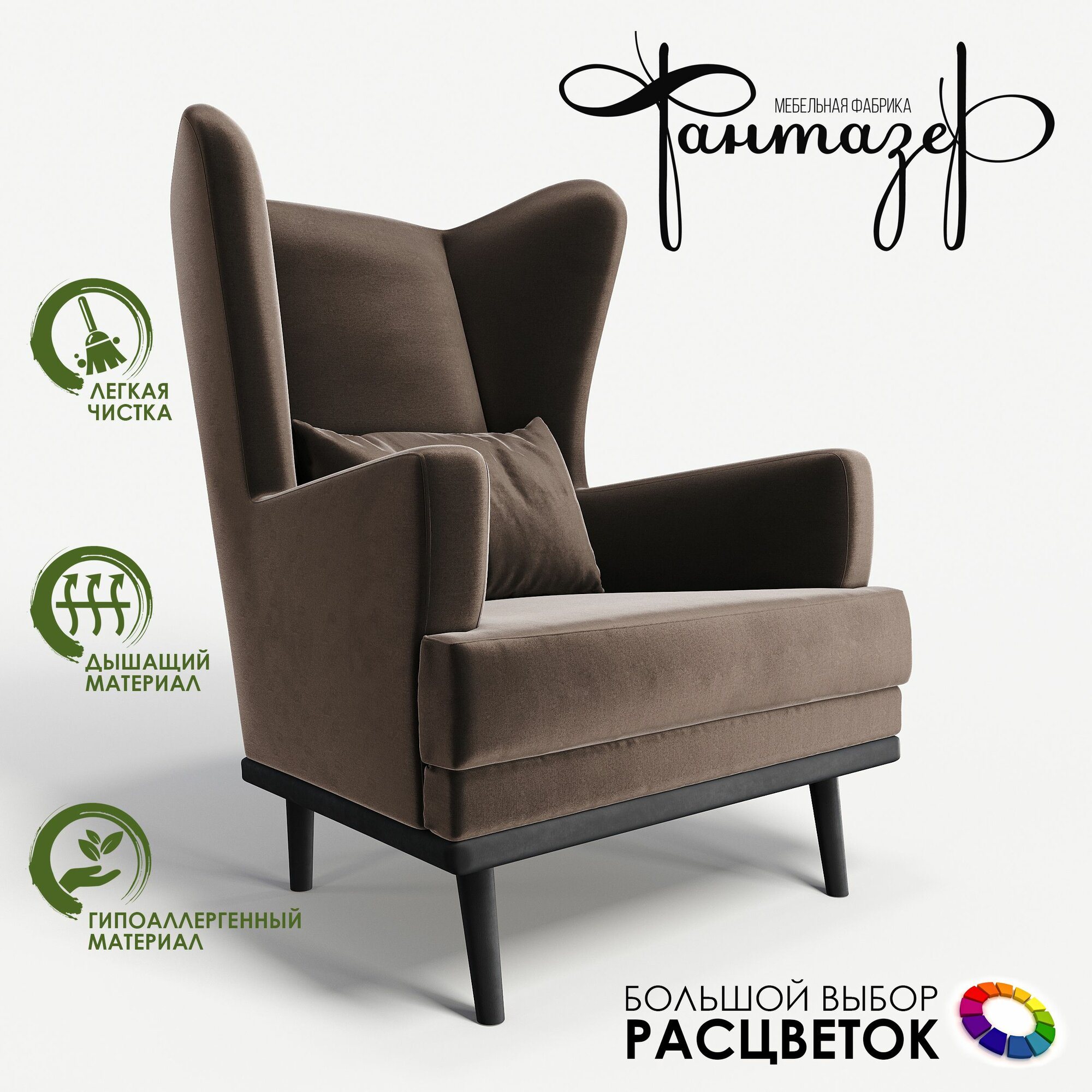 Мягкое кресло с ушами Фантазёр искусственный мех темно-коричневый L-13 на высоких ножках, для отдыха и чтения книг. В гостиную, балкон, спальню и переговорную комнату.