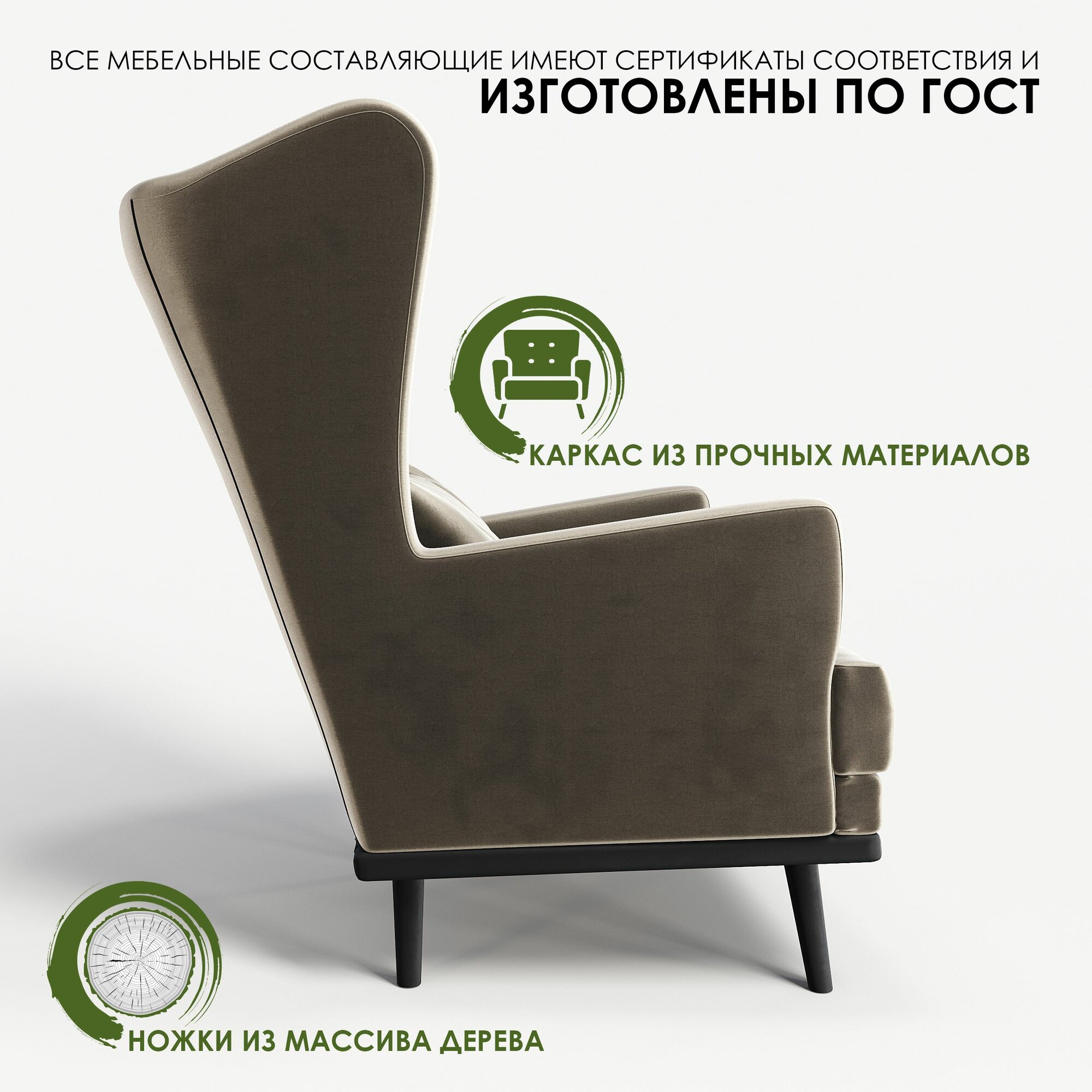 Кресло мягкое с ушами Фантазёр эко-кожа бежевый на высоких ножках, для ожидания, отдыха и чтения книг. Для дома и общественных мест. В гостиную, балкон, спальню и переговорную комнату.