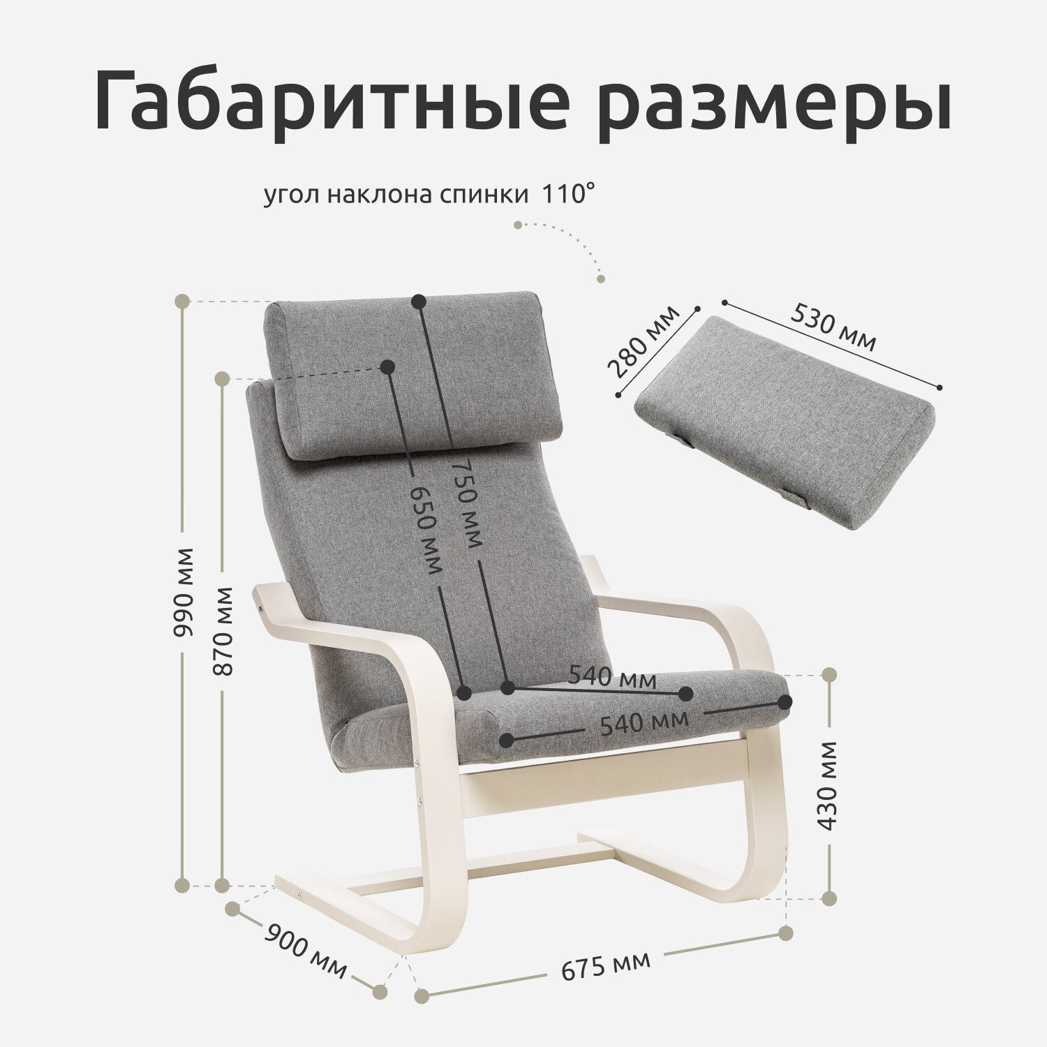 | Дополнительная информация | Высота от пола до сиденья — 430 Ширина подлокотника — 70 мм. Толщина мягкого элемента — 100 мм. Высота подлокотников от пола — 500 мм. Высота от сиденья до подлокотника— 100/140 мм. Размер подушки под голову — 530x280x70 мм. Наполнитель: поролон марки ST 1828, высшего сорта, толщиной 80мм. Ширина сиденья — 540 Глубина сиденья — 540 Высота спинки (с подушкой) — 750 Высота спинки (без подушкой) — 646 |