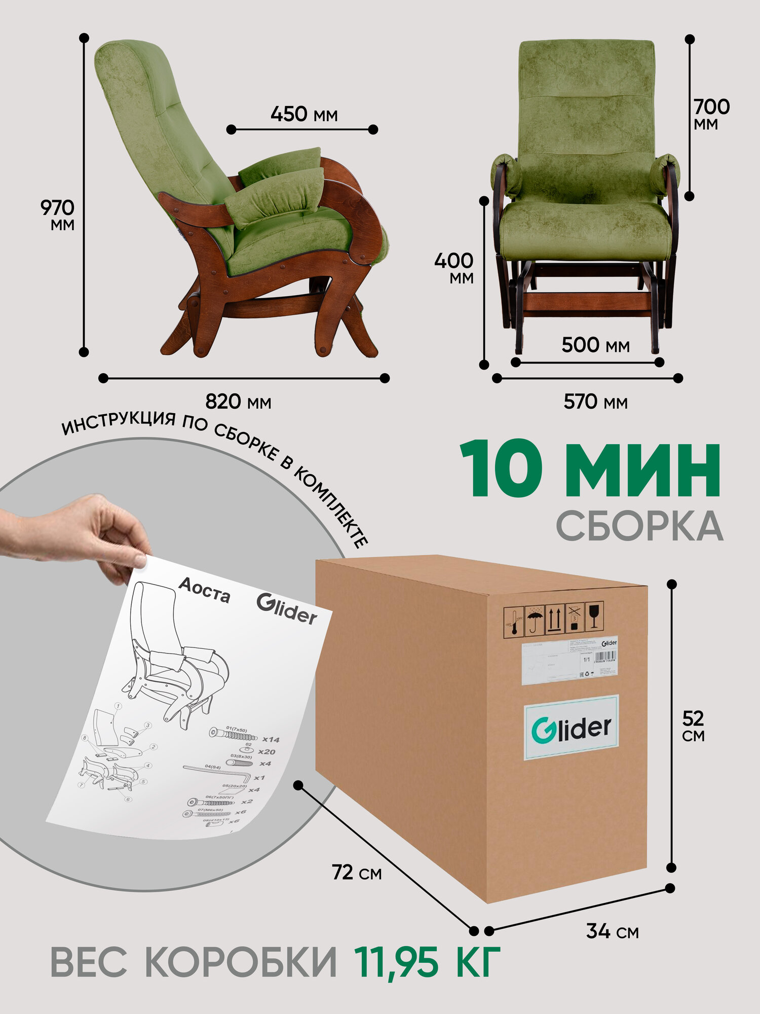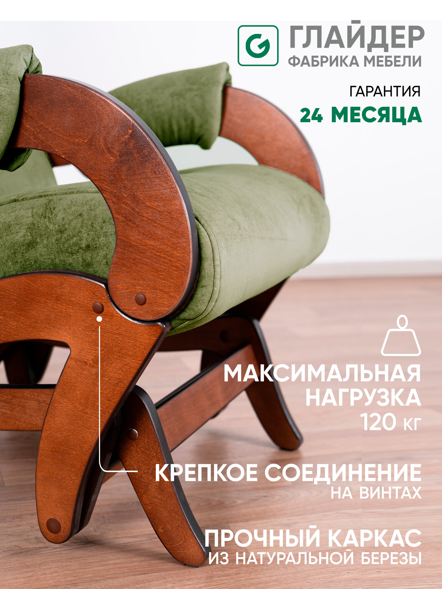 СохранитьКресло-качалка с маятниковым механизмом Glider Аоста в ткани Микровелюр, цвет зеленый / коричневый орех интересное: