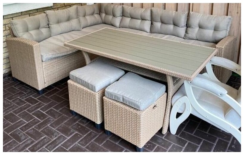 | Комплектация | прямоугольный стол, угловой диван, 2 пуфа |