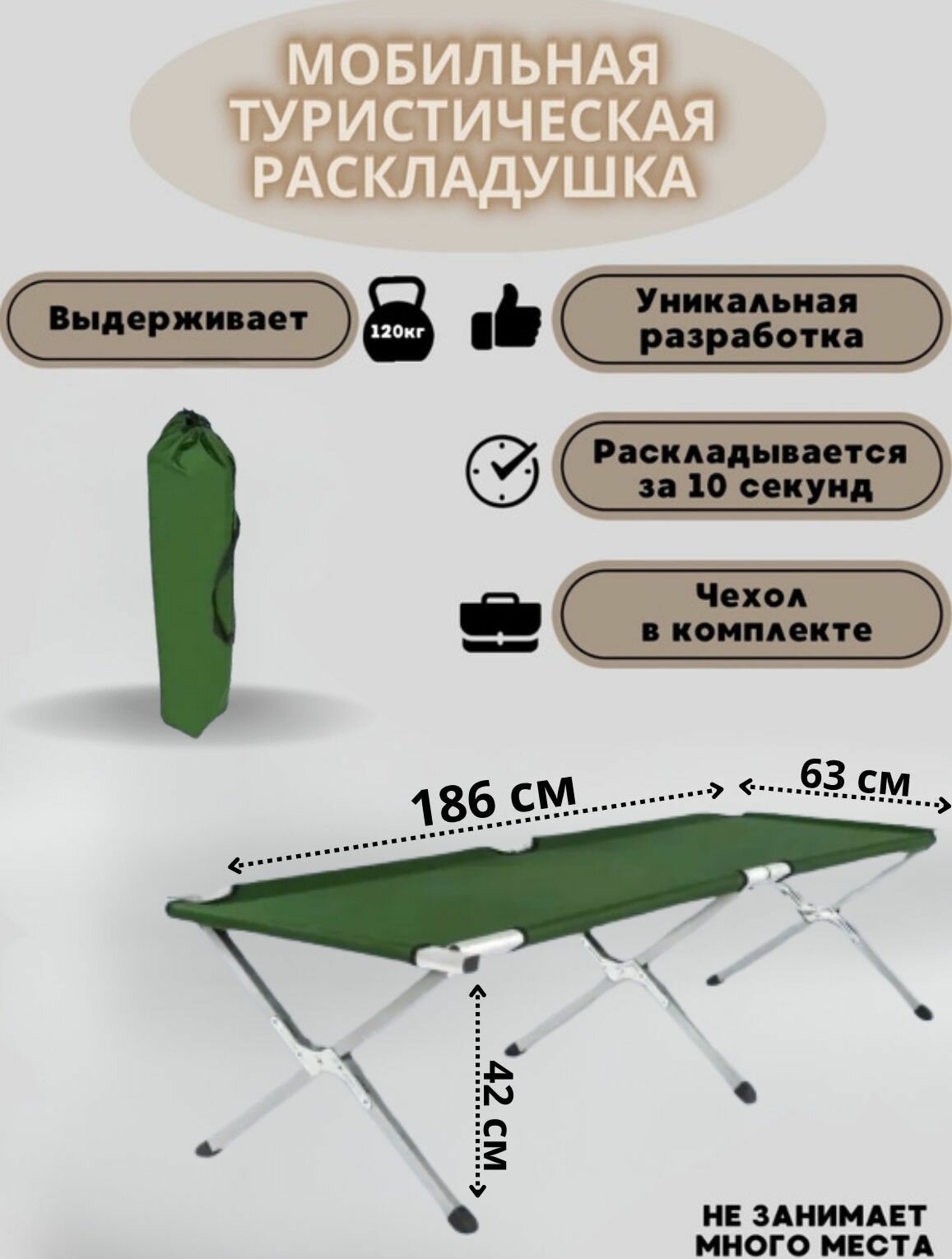 Кровать раскладушка туристическая, кемпинговая походная кровать 186х63х42 см, цвет зелёная интересное: