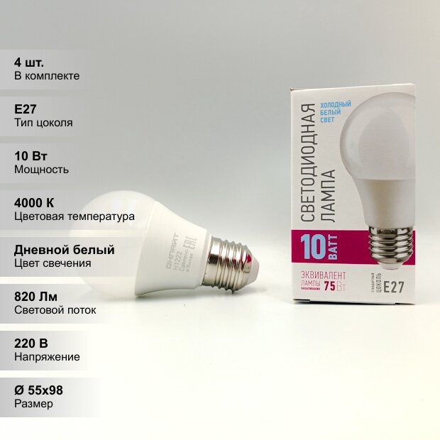 Купить (4 шт.) Светодиодная лампочка онлайт A55, мощность 10 Вт, напряжение питания 220 В, цветовая температура 4000 K, нейтральный белый свет, цоколь E27, размер 55х98 мм