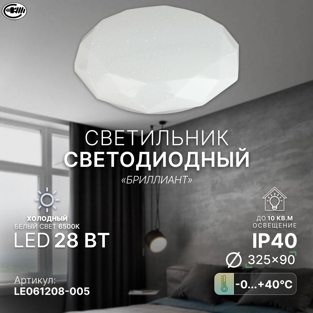 СохранитьСветильник потолочный светодиодный накладной на кухню/ в спальню/ в детскую, 28Вт, люстра потолочная бриллиант, холодный свет, LEEK. Свет-к с/д (потолочный) СЛЛ 041 28Вт 6К Бриллиант (325x90) (10) интересное:
