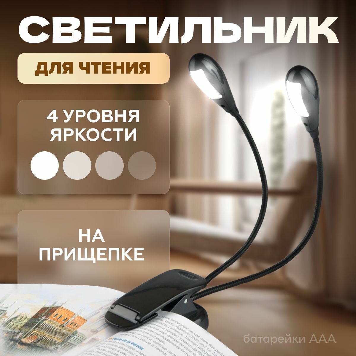 Светильник на прищепке, MELL светодиодный для чтения, работы и учебы / лампа на батарейках портативная для крепления на книгу интересное: