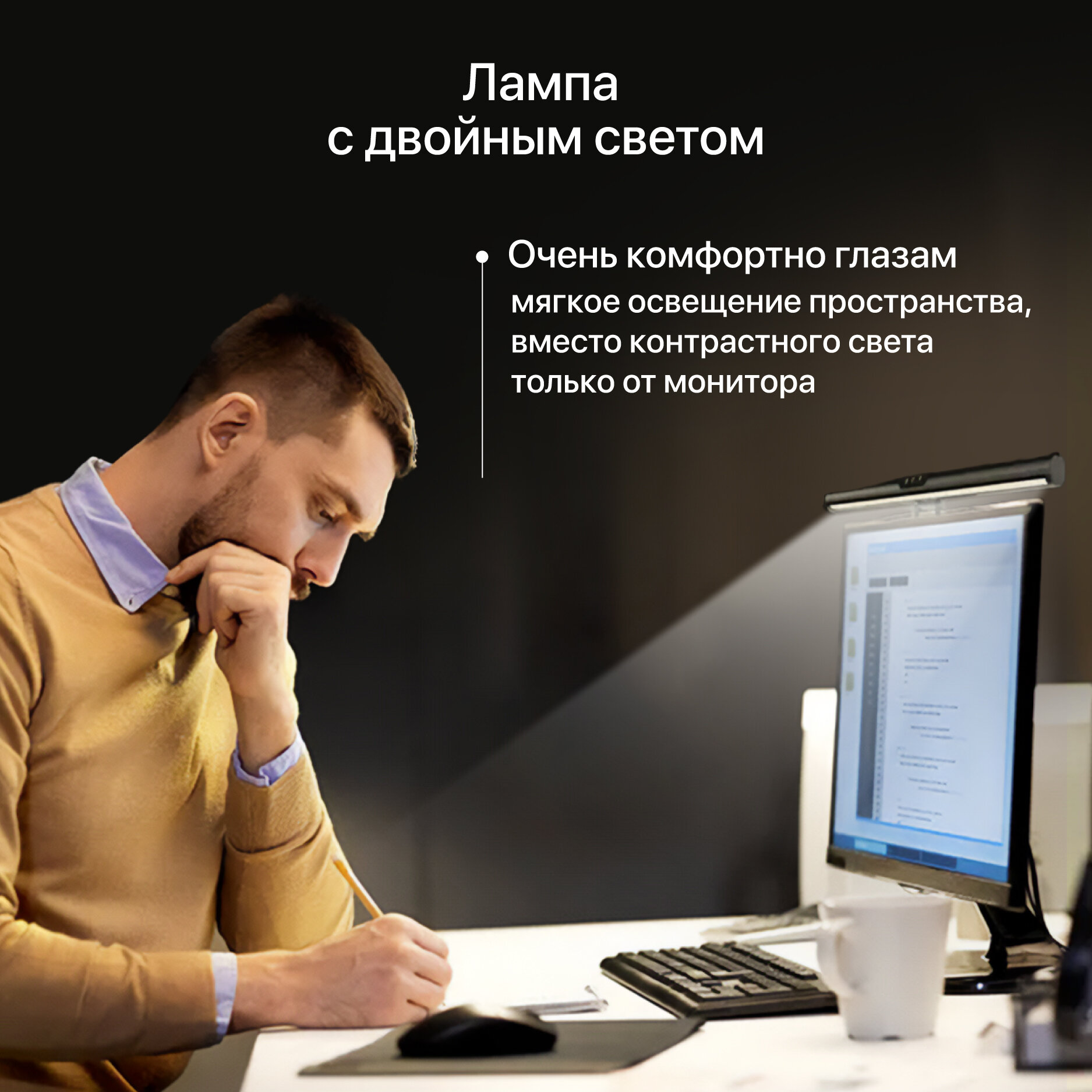 | Дополнительная информация | Лампа для экрана монитора осветит клавиатуру и зону рабочего стола перед экраном. Светильник формирует бестеневое освещение, которое при длительной работе не создает дискомфорта и не ослепляет яркостью. Лампу можно подключить к компьютеру или ноутбуку, и она будет автоматически включаться вместе с ним. |