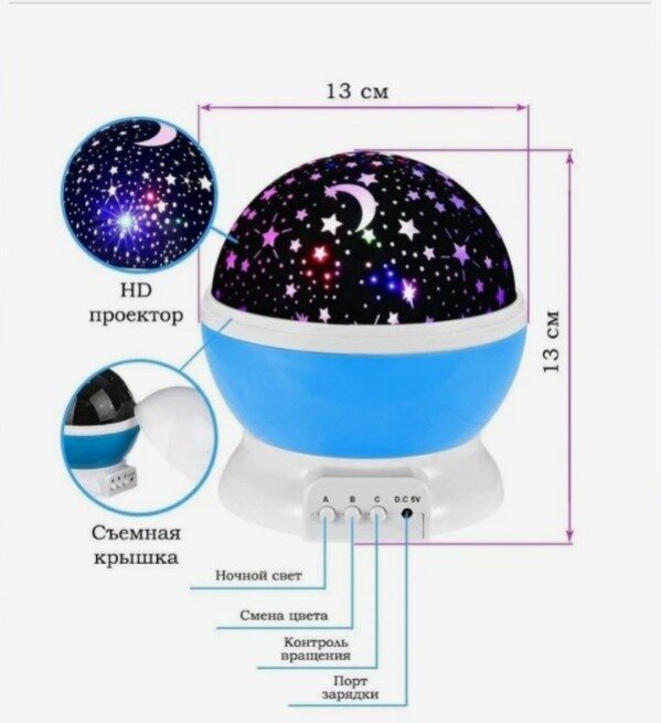 | Дополнительная информация | 3 кнопки: белый свет, цветное свечение и режим вращения |