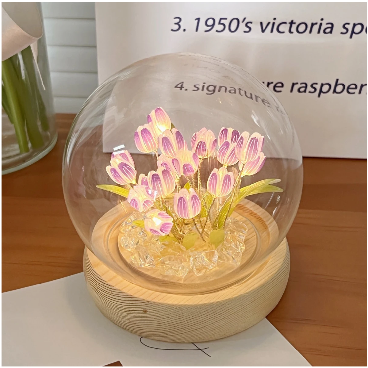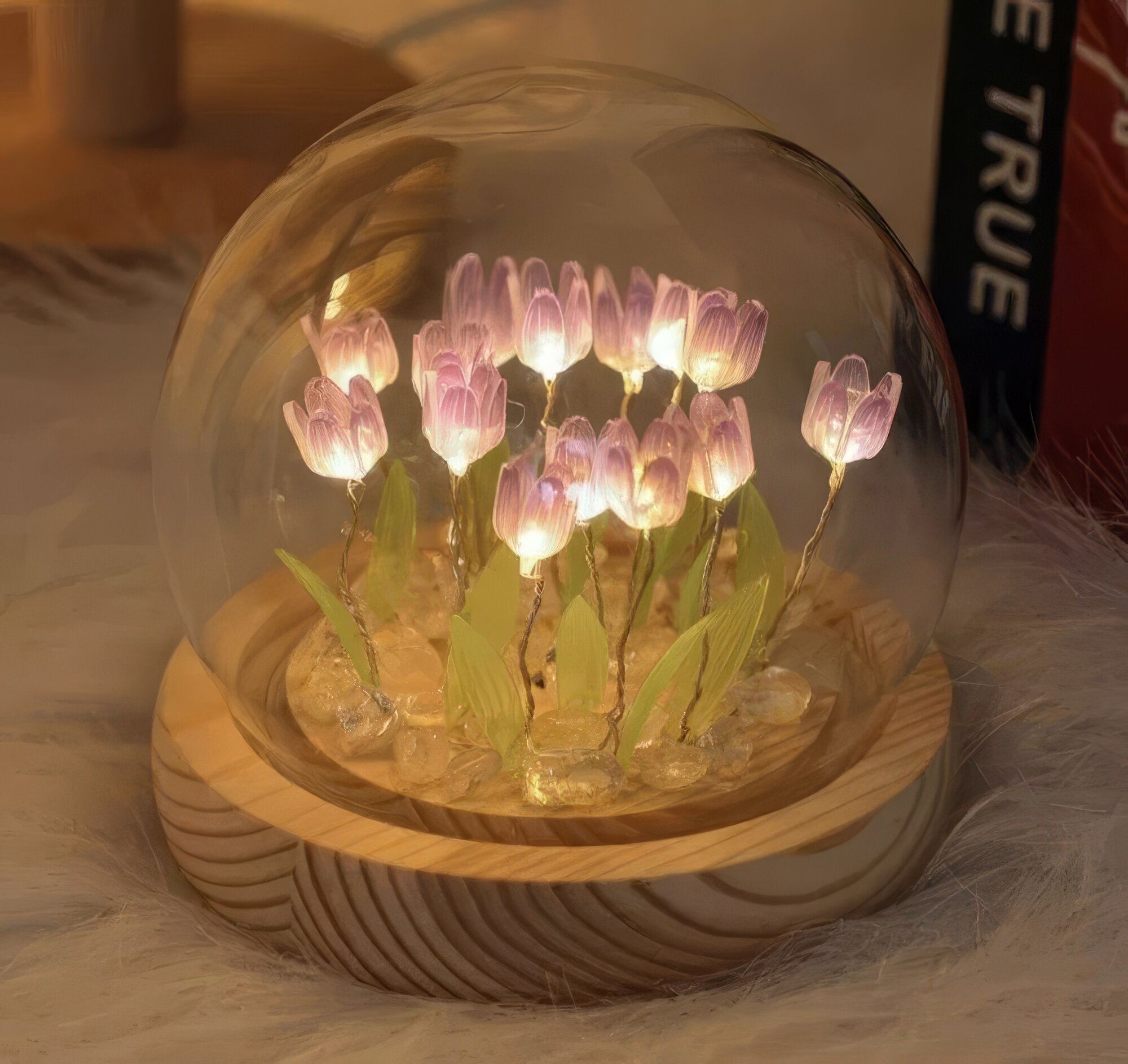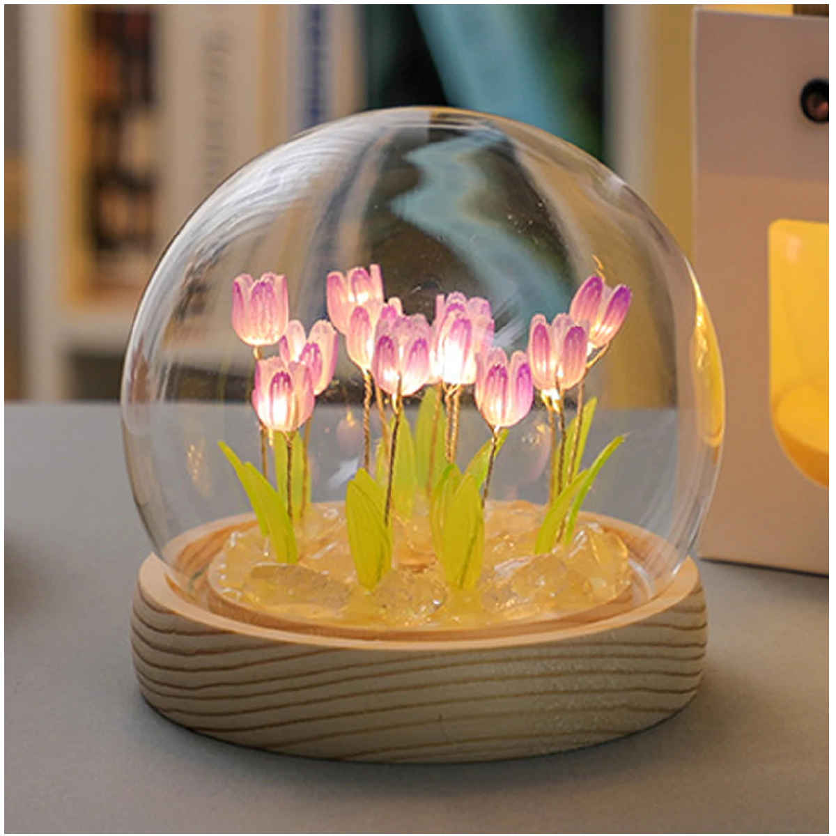 Декоративный светодиодный ночник тюльпаны / Светильник ночник цветы в колбе 10х10 см. Розовый