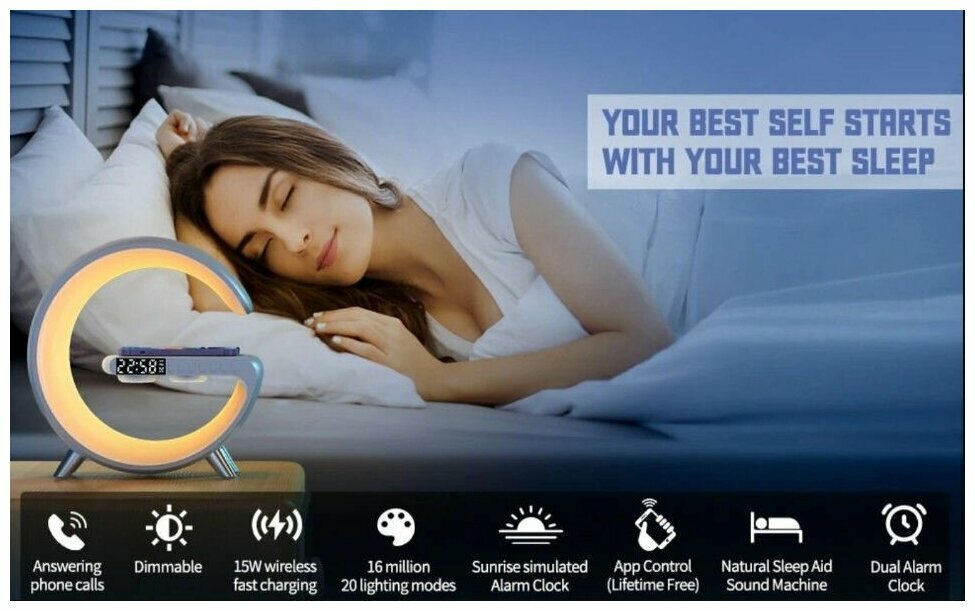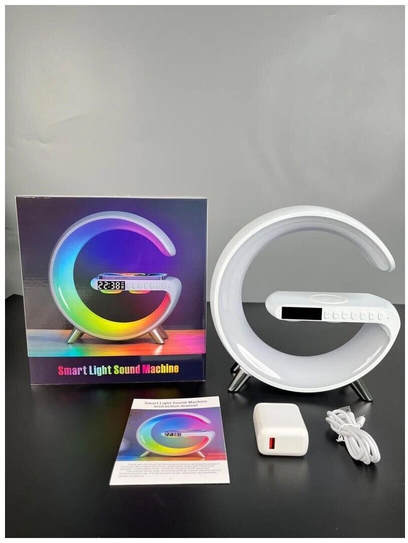 Ночник с беспроводной зарядкой, bluetooth-колонкой, часами и будильником. (белый) интересное: