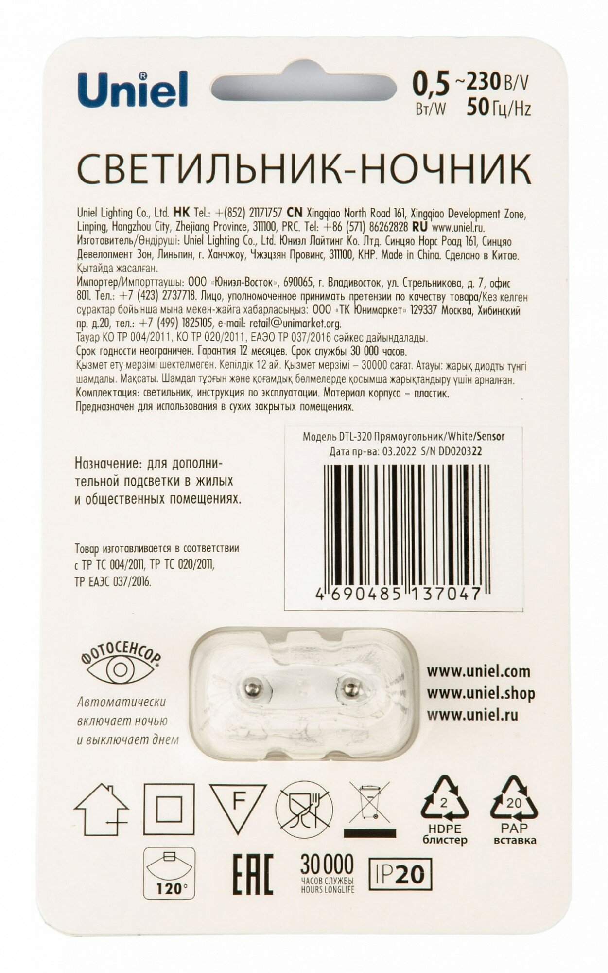 светильник-ночник 0.5W Белый UL-00007221 DTL-320 Прямоугольник Sensor белый интересное: