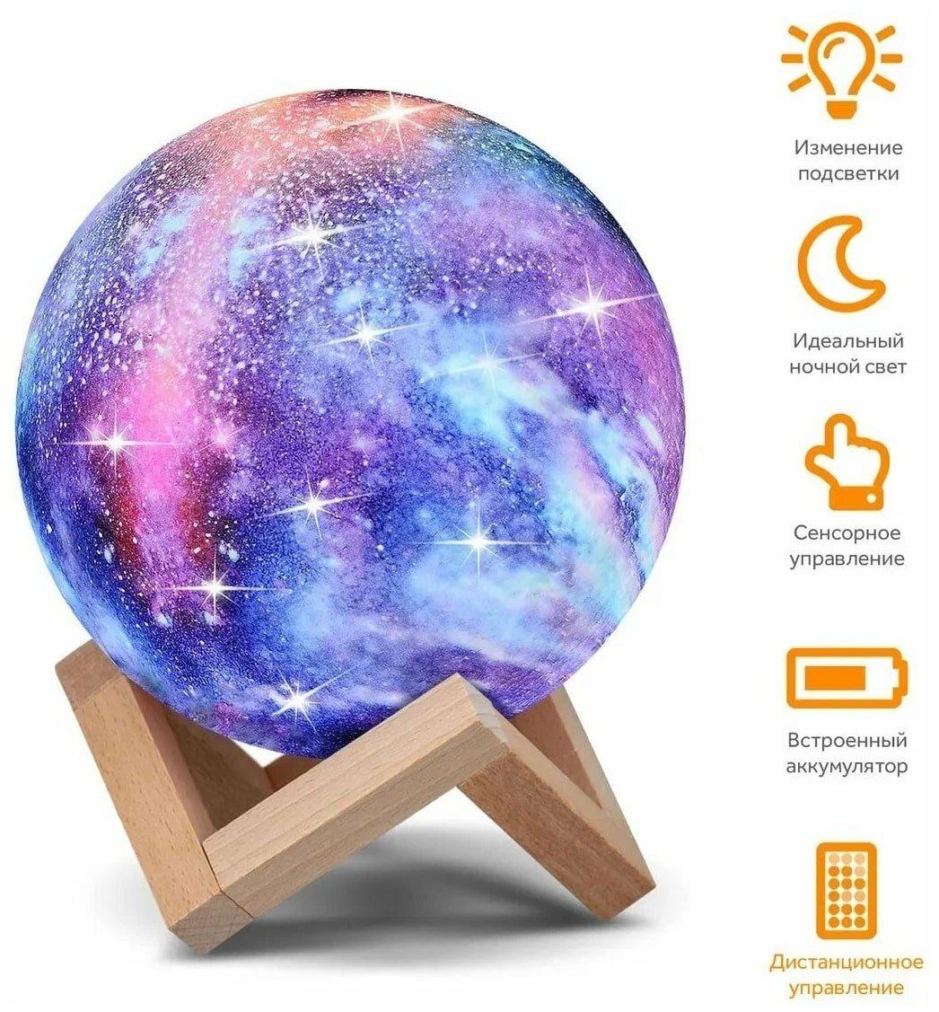 Ночник-светильник с пультом 3D шар Галактика с сенсорным управлением на деревянной подставке с пультом, 15 см интересное: