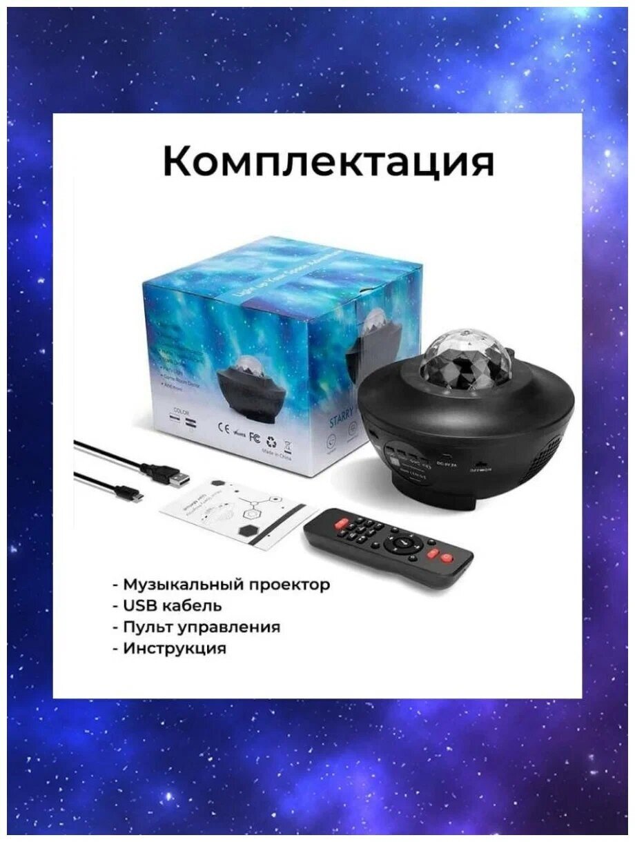 | Комплектация | ночник-проектор; USB кабель; пульт ДУ; инструкция; |