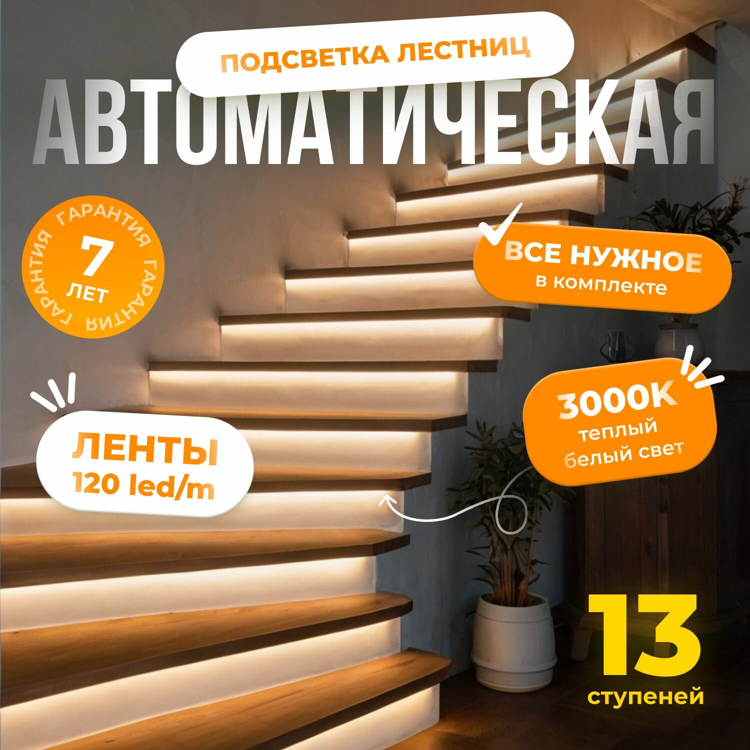 Автоматическая подсветка лестницы с датчиками движения теплый свет 3000К 14 ступеней Soft Lights