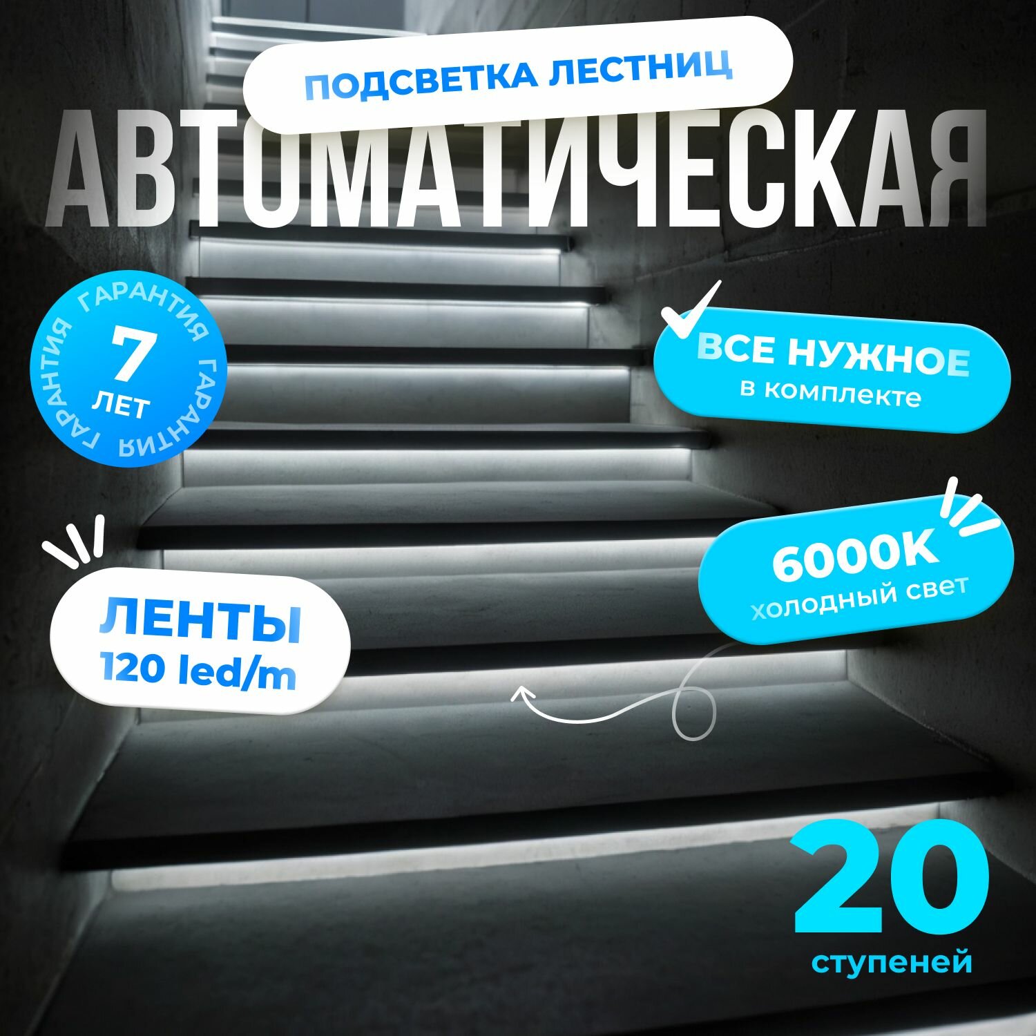 Автоматическая подсветка лестницы с датчиками движения холодный свет 6000К 19 ступеней Soft Lights