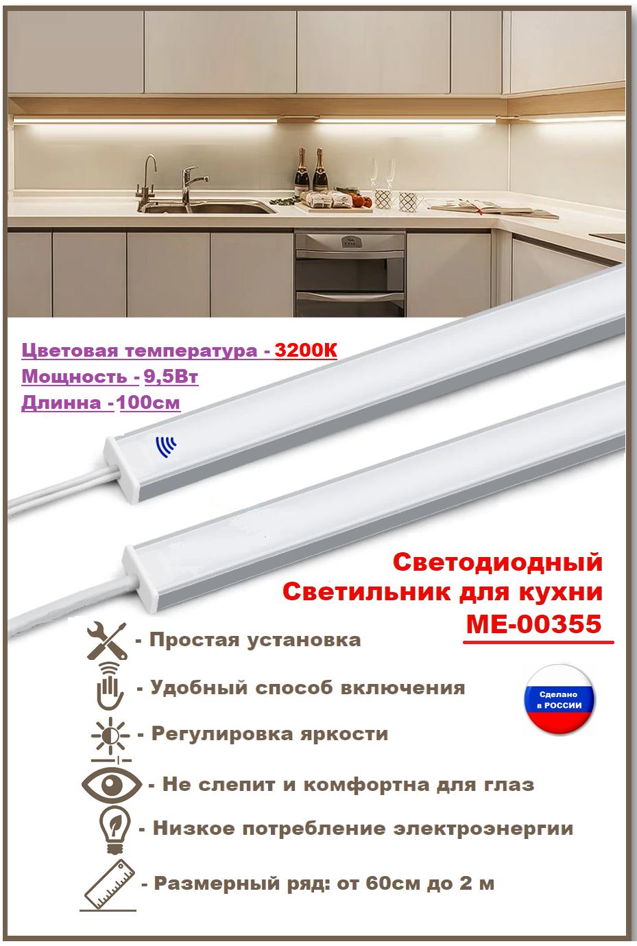 СохранитьСветодиодный светильник для кухни под навесные шкафы, с включателем от взмаха руки, 100см, 3200К-тёплый. интересное: