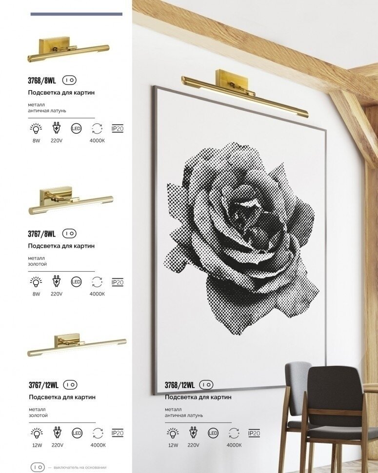 Lumion 3767/8WL PICTURE LN19 249 золотой Подсветка для картин с выкл. LED 8W 4000К 716Лм 220V HIKARI