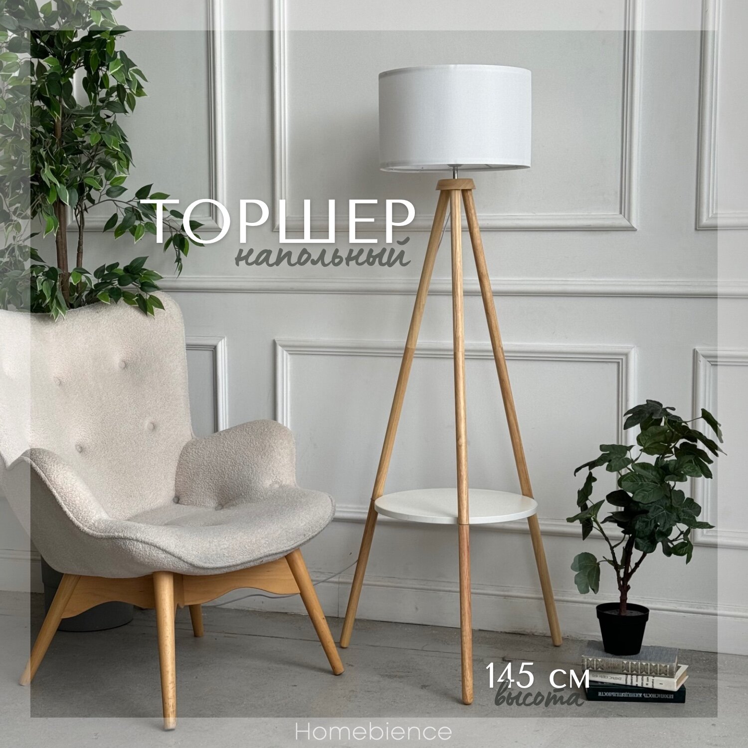 Купить Торшер напольный тренога светлый с полкой/Светильник деревянный сканди