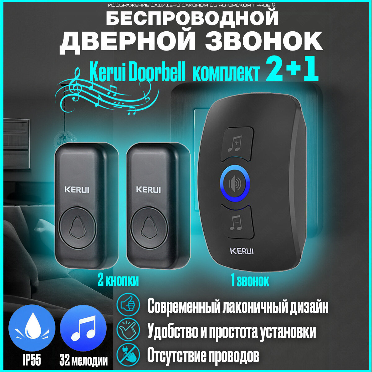 Беспроводной дверной звонок, влагощащенная кнопка вызова, комплект электронного звонка на 2 кнопки Kerui Doorbell Duo Black интересное: