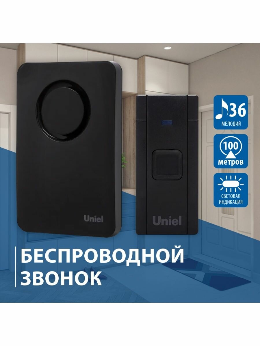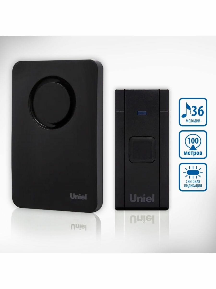 Звонок с кнопкой Uniel UDB-014W-R1T1-36S-100M-BL электронный беспроводной (количество мелодий: 36) черный