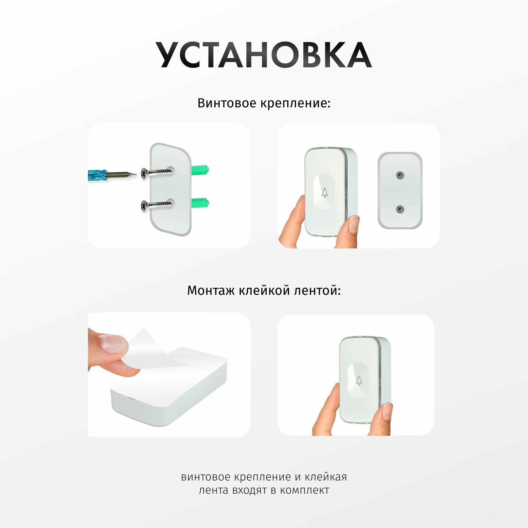 | Дополнительная информация | Комплектация: Дверной звонок беспроводной 1 шт., Кнопка дистанционного управления 1 шт., Инструкция 1 шт. Крепление: Самоклеющаяся основа 1 шт., Отвертка 1 шт., Винт крепежный 2 шт. |