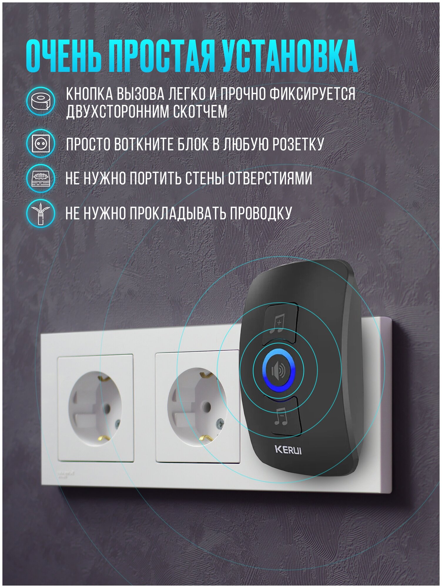 | Дополнительная информация | В комплекте: звонок, который включается в розетку; кнопка звонка (батарейка внутри); саморезы для установки кнопки; документация; упаковка. |