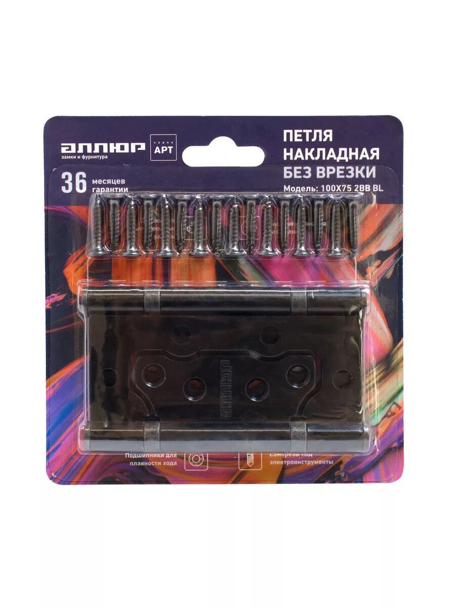Петля накладная для деревянных дверей, Аллюр, 100х75х2.5 мм, универсальная, 2ВВ BL, 14532, 2 шт, коробка, матовый черный