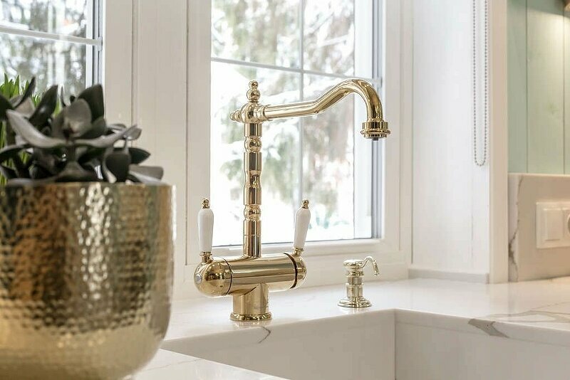 | Отзыв: | Красивый удобный смеситель с большим вылетом, установили его прямо на столешницу, а не на раковину – очень довольны. Смотрится эффектно и пользоваться им одно удовольствие! Очень рада, что нашла смеситель такой формы и более-менее стандартного цвета. Классический стиль любят красить в черно-бело-желтый, а я искала именно такой! Латунный корпус блестит очень красиво, выглядит дорого. Рычажок включения/переключения расположен немного непривычно для меня, но через недельку перестаешь это замечать. Для установки не рекомендовала бы использовать начинающих мастеров-любителей, муж чуть не сломал его со всей своей силой приложившись к умному смесителю. Лучше заплатите профессионалу, долговечнее будет кран! |