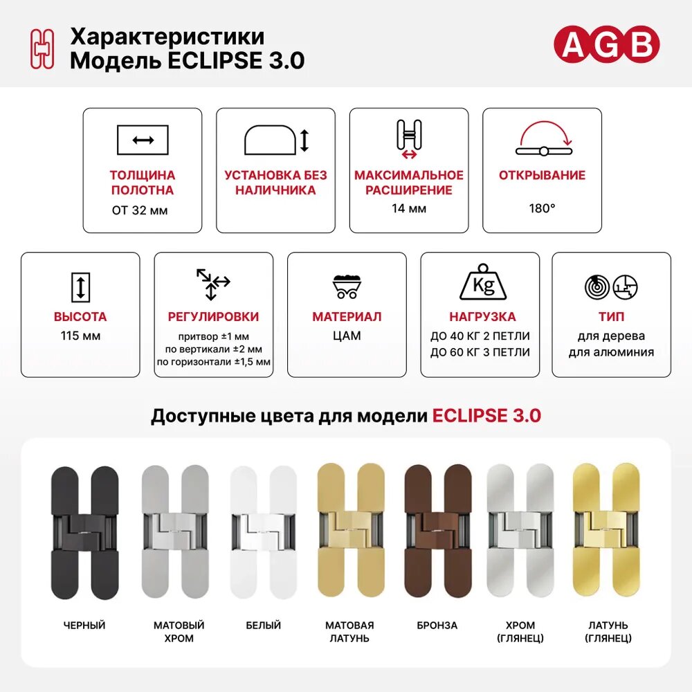 Петля скрытой установки AGB (АГБ) ECLIPSE 3.0 хром Е 302000206 4 накладки в комплекте