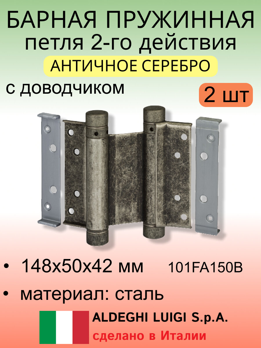 Барная пружинная петля двойного действия ALDEGHI LUIGI SpA 148х50х42 мм, античное серебро, к-т: 2 шт + ключ с декоративными шурупами, 101FA150B