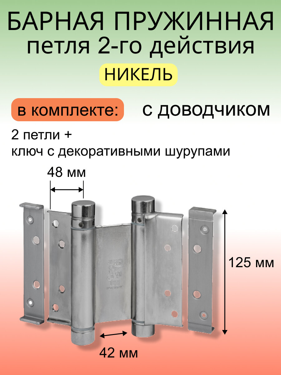 Барная пружинная петля двойного действия ALDEGHI LUIGI SPA 125х48х42 мм, цвет: никель, к-т: 2 шт + ключ с декоративными шурупами 101AN125B