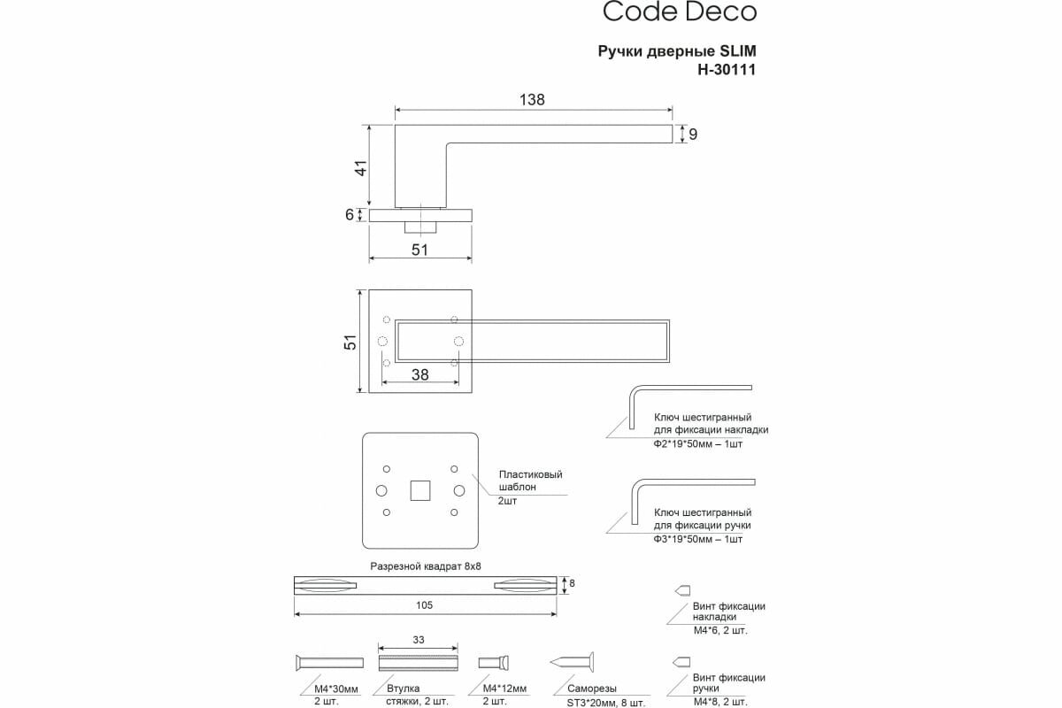 | Комплектация | Ручки дверные - 2шт, стяжки M4 12(33)30 - 2 шт, саморезы SТ3*20 - 8 шт, винт фиксации - 4 шт, ключ шестигранный - 2 шт. |