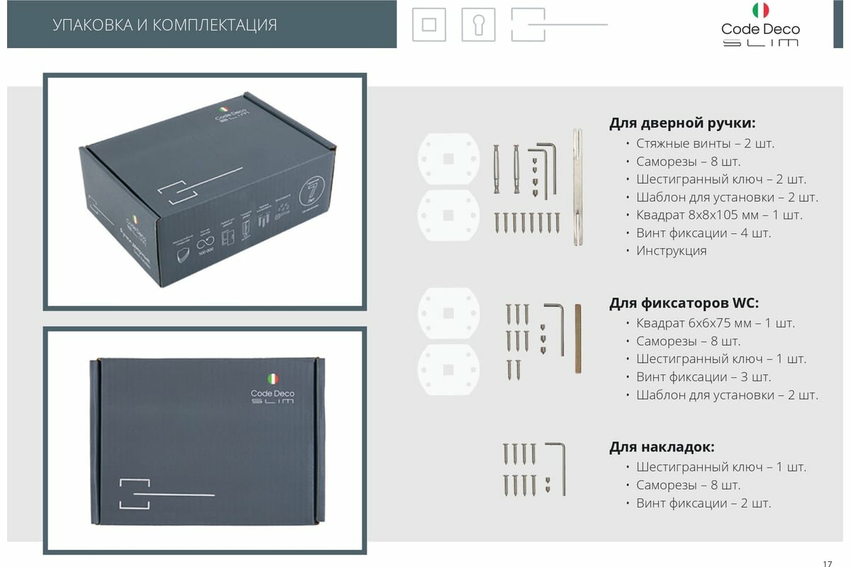 | Комплектация | Ручки дверные - 2шт, стяжки M4 12(33)30 - 2 шт, саморезы SТ3*20 - 8 шт, винт фиксации - 4 шт, ключ шестигранный - 2 шт. |