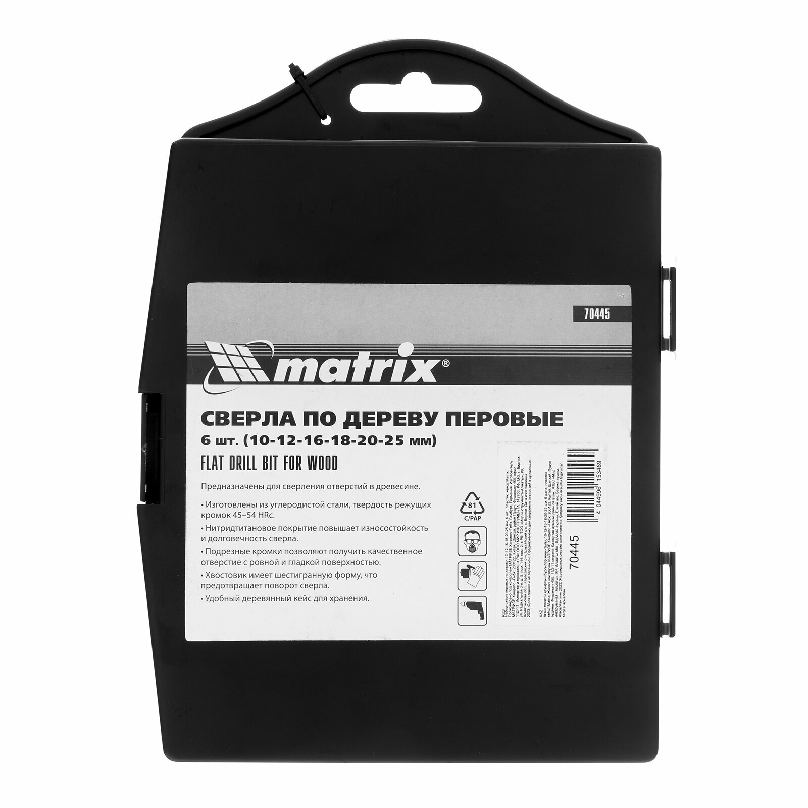 Набор сверл перовых по дереву Matrix 10-12-16-18-20-25 мм, 6 шт, пластик. кейс 70445