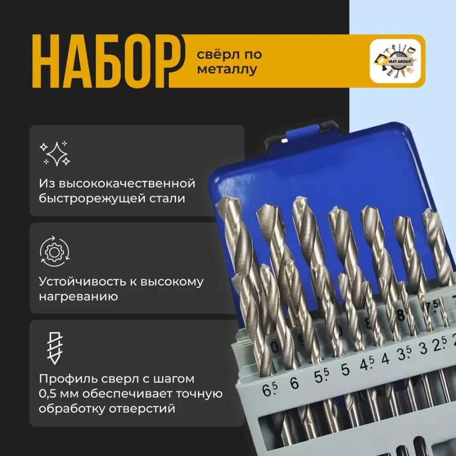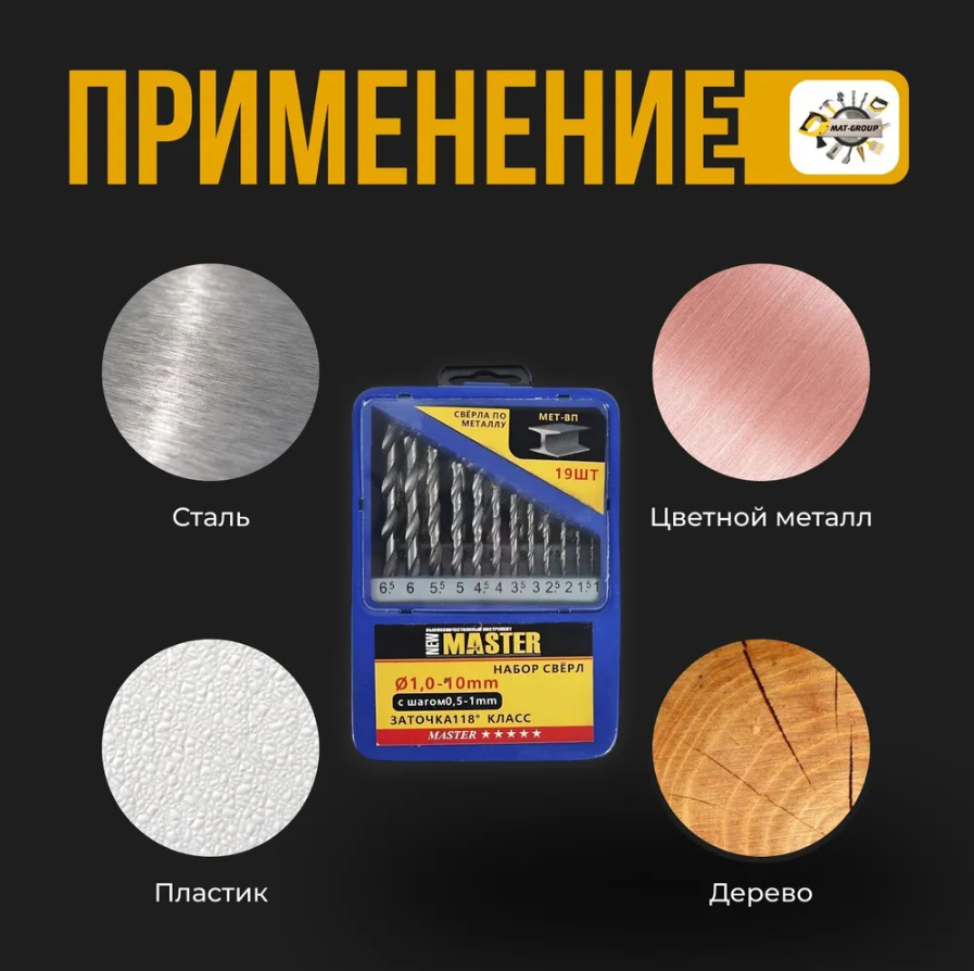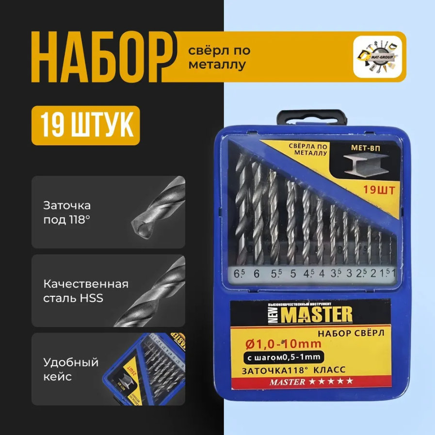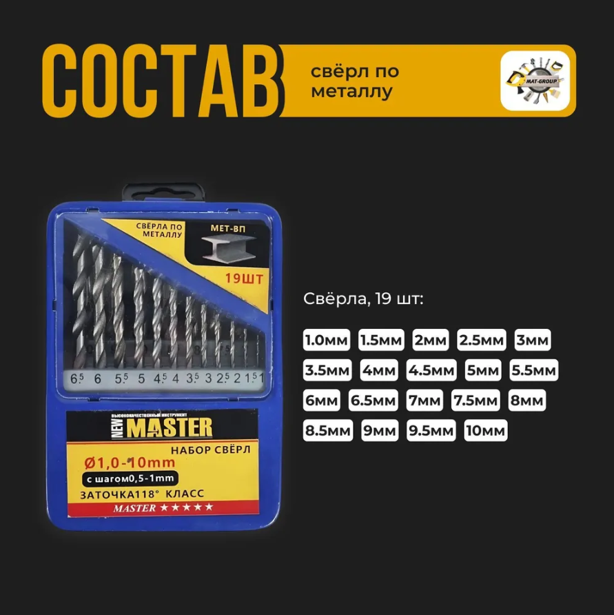 | Дополнительная информация | Набор сверл по металлу, 1-10 мм (через 0,5 мм), HSS/19 шт |