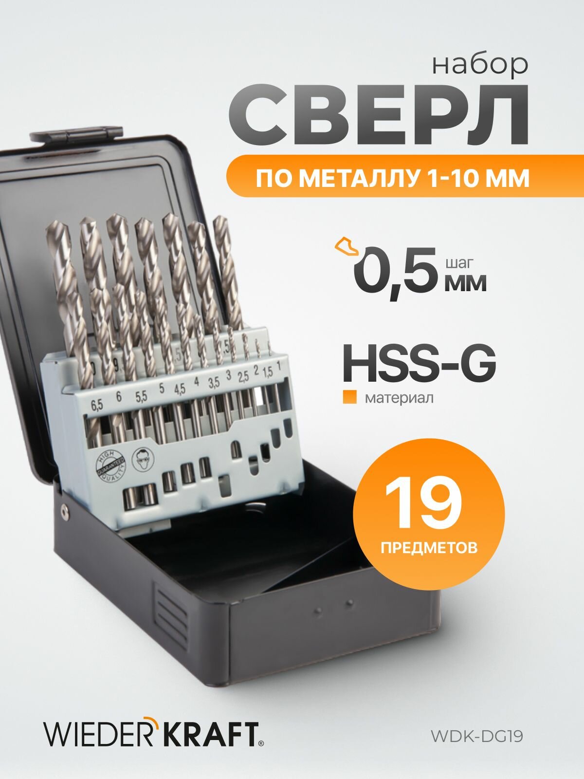 WiederKraft Набор сверл по металлу 1-10 мм, шаг 0,5 мм, HSS-G, 19 предметов, металлический кейс WDK-DG19