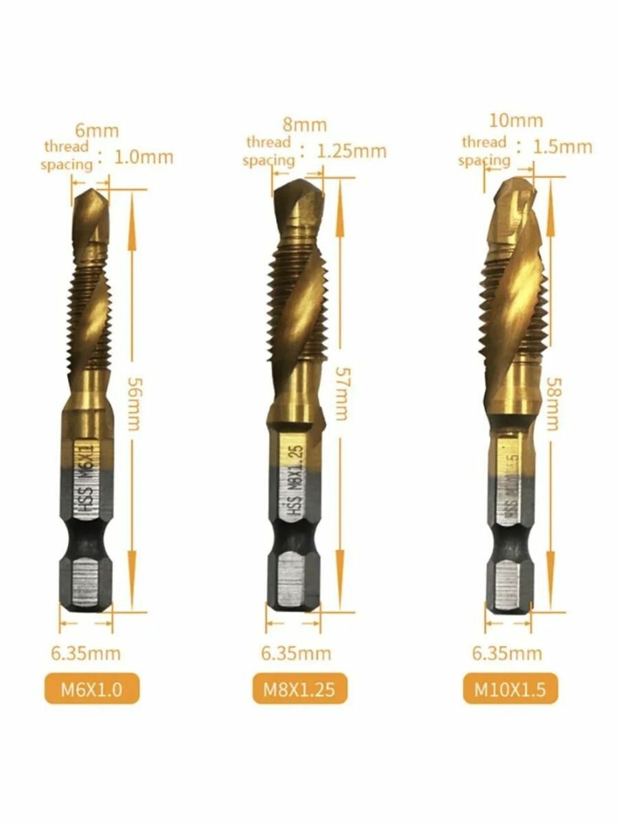 | Размеры сверл | Сверло-метчик с титановым покрытием, набор из 6 штук/ Набор метчиков в боксе / Сверло-метчик с титановым покрытием |