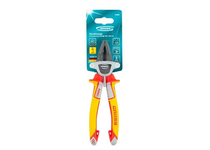 Плоскогубцы комбинированные Gross 16989, диэлектрические трехкомпонентные рукоятки до 1000 В, 180 мм
