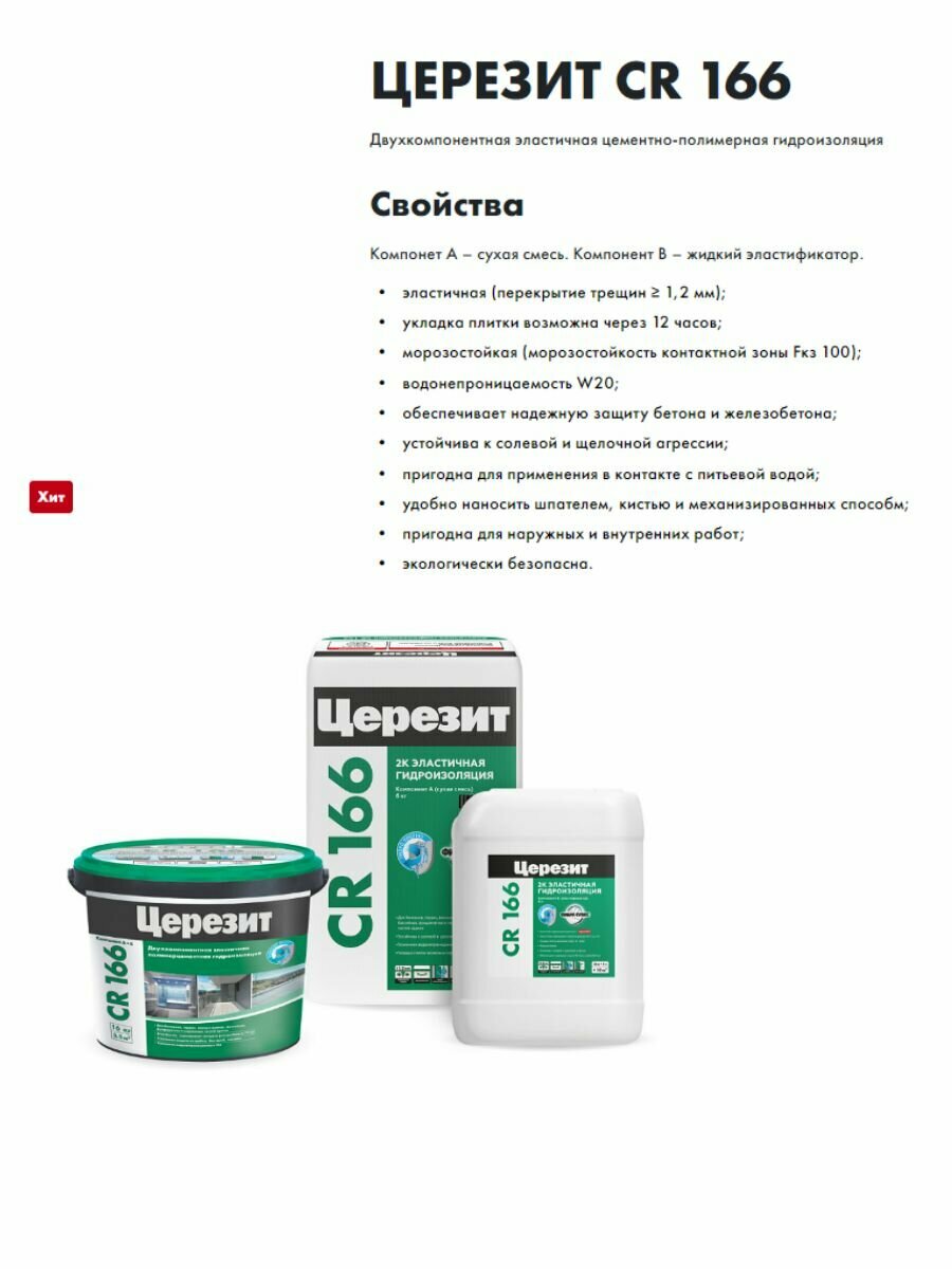 Гидроизоляционная масса двухкомпонентная Ceresit CR 166, компоненты A и Б, 16 кг