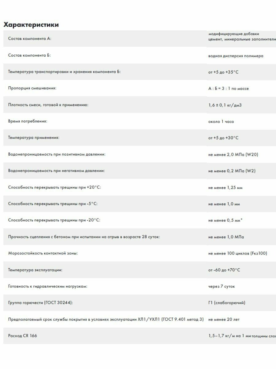 | Дополнительная информация | перекрывает трещины раскрытием до 0.75 мм; наносится слоем общей толщиной 1.0– 1.5 мм; плотность 1.55 ± 0.05 кг/дм3; время высыхания 1-го слоя: около 2 часов; высыхания 2-го слоя: около 4 часов; водонепроницаемость в возрасте 7 суток не менее 0.2 МПа; адгезия к бетону не менее 1,5 МПа; термостойкость до +70°С; толщина свеженанесенного слоя при расходе 1.4 кг/м2 около 1.0 мм; толщина высохшего слоя при расходе 1.4 кг/м2 около 0.4 мм |